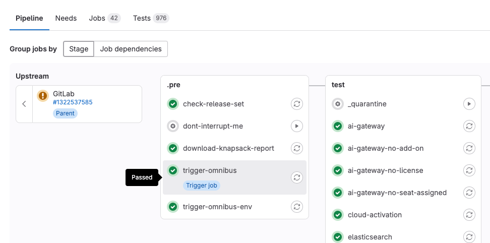 When you push a commit to either the GitLab CE or GitLab EE project, the pipeline for that commit will have a trigger-omnibus job inside e2e:test-on-omnibus-ee child pipeline in the .pre stage.