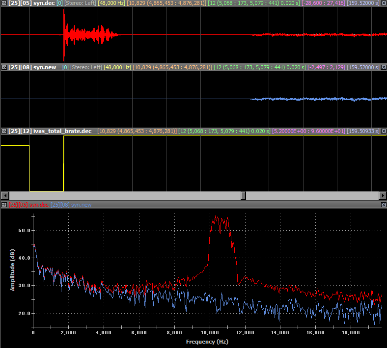 From top: synthesis (left channel in stereo decoding), synthesis (left channel) when the length of local buffers was increased in functions ivas_mct_enc() and ivas_mct_core_enc(), IVAS total bitrate, spectrum.