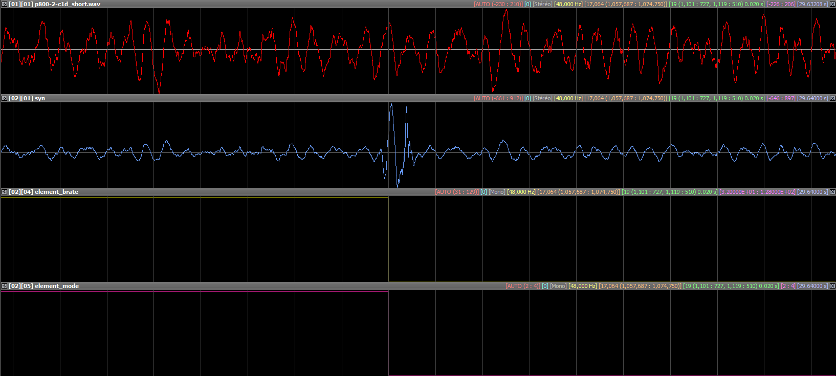 As a result, the old_inp_12k8[] buffer ends up with discontinuities in its middle section, corresponding to the overlap part of the DFT analysis/synthesis window. This ultimately leads to artifacts in the synthesis signal, as shown in the following graph: