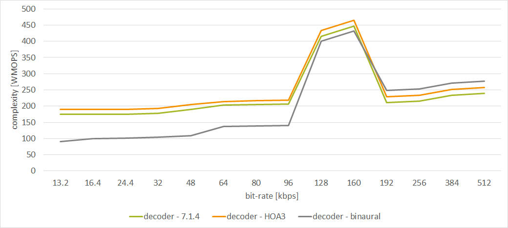 Using the code-base SHA-1: 30b12f8d from September 9, 2022, there was observed the highest decoder complexity in the MC for bitrates 128 and 192 kbps and output config. 7.1.4, HOA3, or binaural: