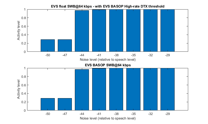 The EVS BASOP has a more conservative behaviour than float. In a 2 minute test signal consisting of a repeated speech utterance with pink noise at different relative speech levels added, this is the activity obtained for BASOP and float: