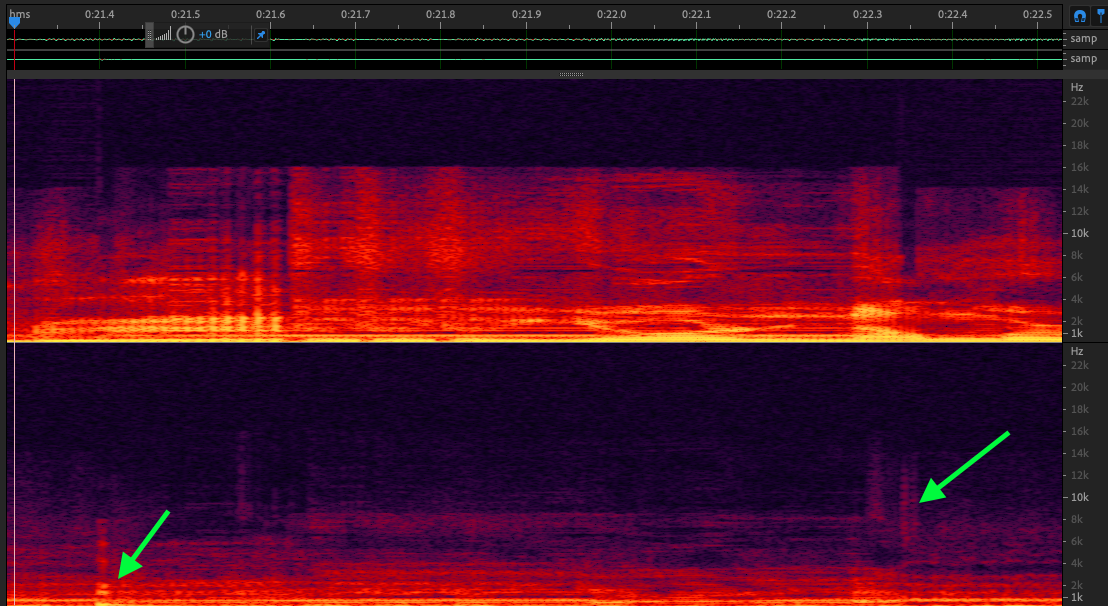 There are plops and clicks in characterization item, coded with unified stereo at 24.4kbps. Looking at the spectrogram these artifacts most likely occur from switching from DFT stereo to LRTD. Plop happens at frame 1070 and click at frame 1117 both at the right channel as can be seen in the spectrogram: