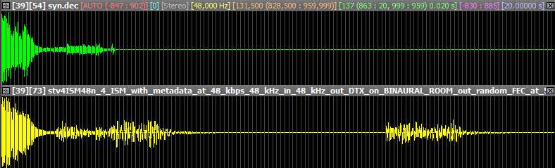 Coding the testvector stv4ISM48n.wav in DTX, there are added annoying noisy segments. This is due to CNA being applied on signals being initially a silence but following noisy segments. The DTX off operation is fine. I am not sure if something can be done with this signal though...
