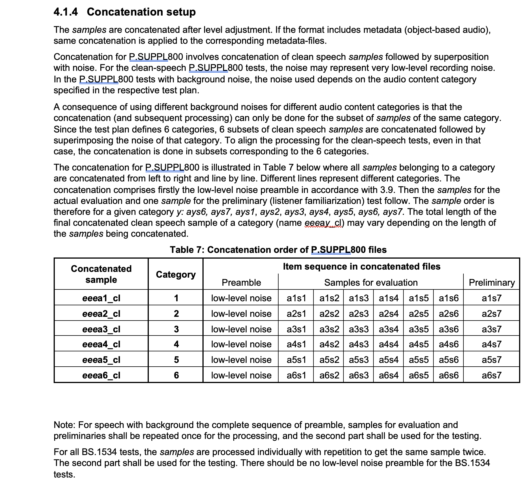 | sequence a | sequence b |), resulting in the "Pre-processed input", which is then fed to the encoder The result of this repetition is| pre-amble | item01 | item02 | item03 | item04 | item05 | item06 | item07 | pre-amble | item01 | item02 | item03 | item04 | item05 | item06 | item07 | - after coding/decoding/rendering, the first iteration of the sequence is discarded, i.e. the second iteration of the sequence is used for the listening tests.