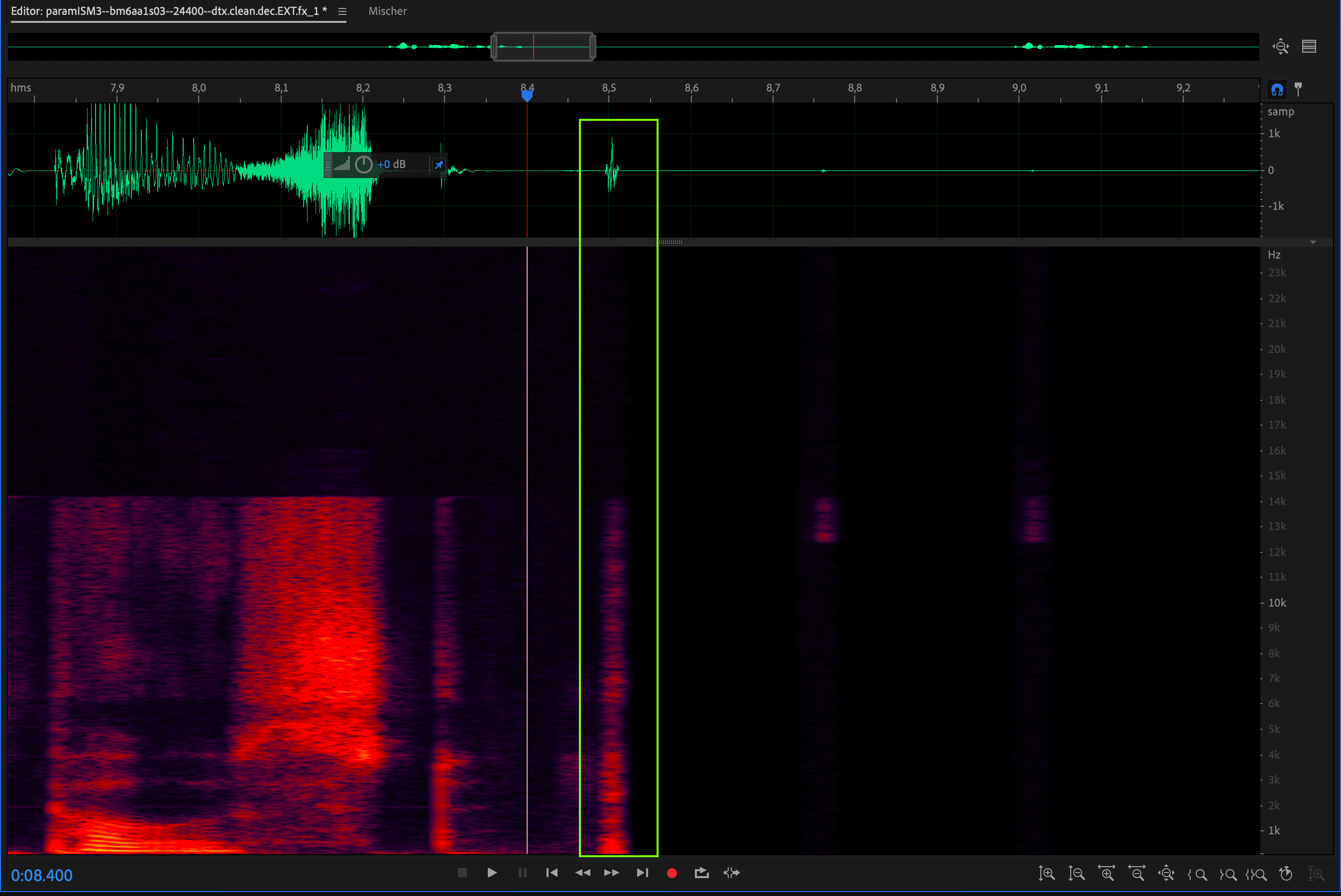 For EXT output, we see at a few spots a relatively high difference in amplitude, resulting in high MLD values (> 5). The example here is for the first object (i.e., first channel) at 8.52s.