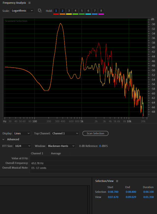 As seen in the following screen captures, major spectral discrepancies were observed in the frequency range from 1 to 5 kHz in the fixed- floating-point decoded output. Following plot illustrates the different spectra in channel#9. Red is fixed-point output, orange/yellow is floating point output. Time range is between 8.7 to 8.8s.