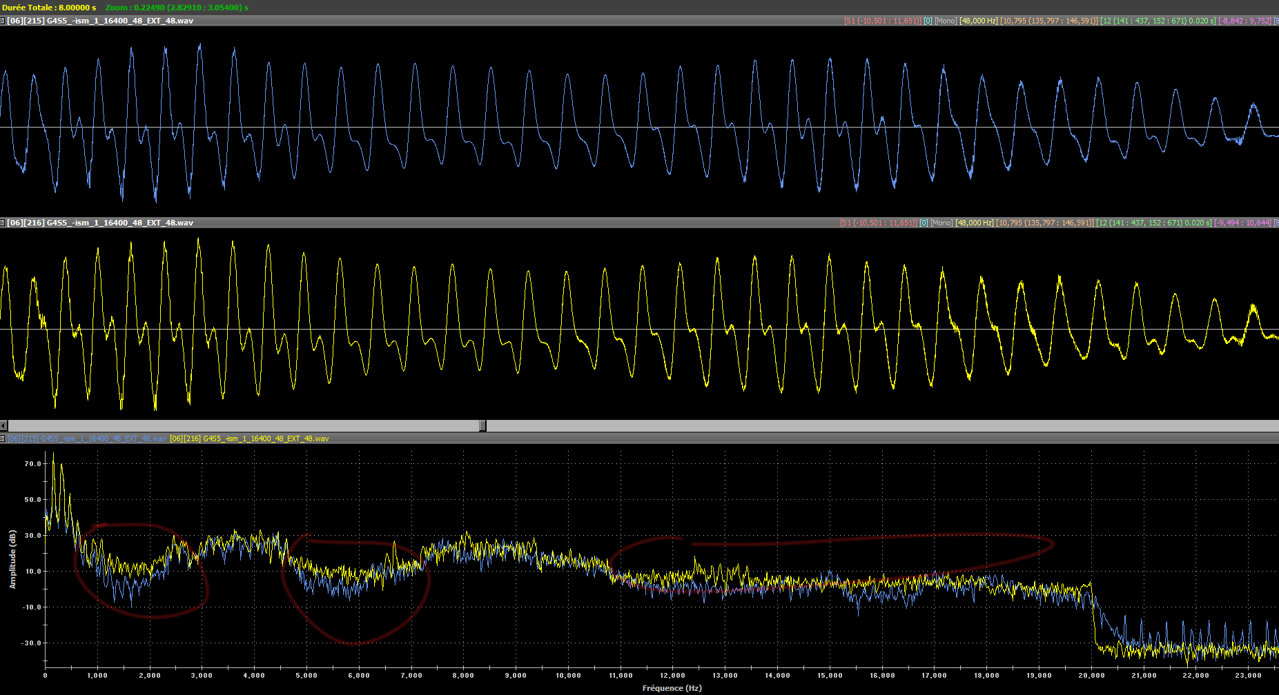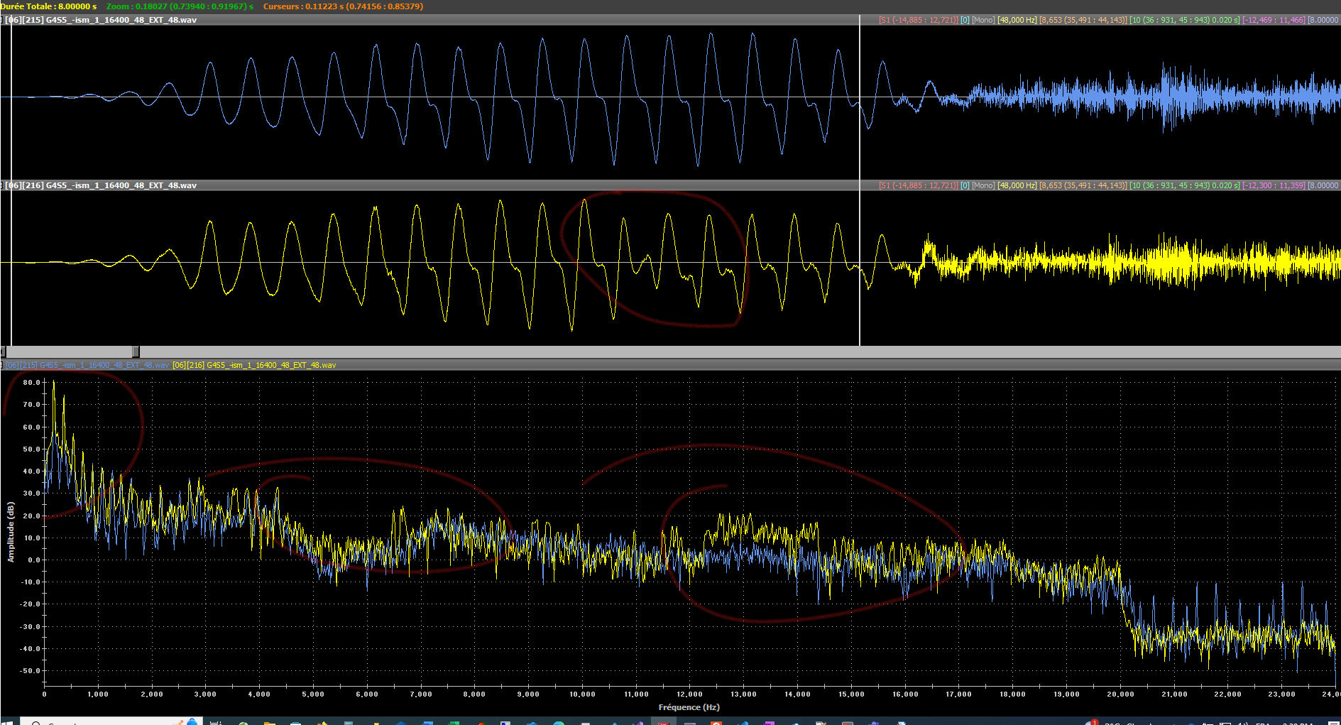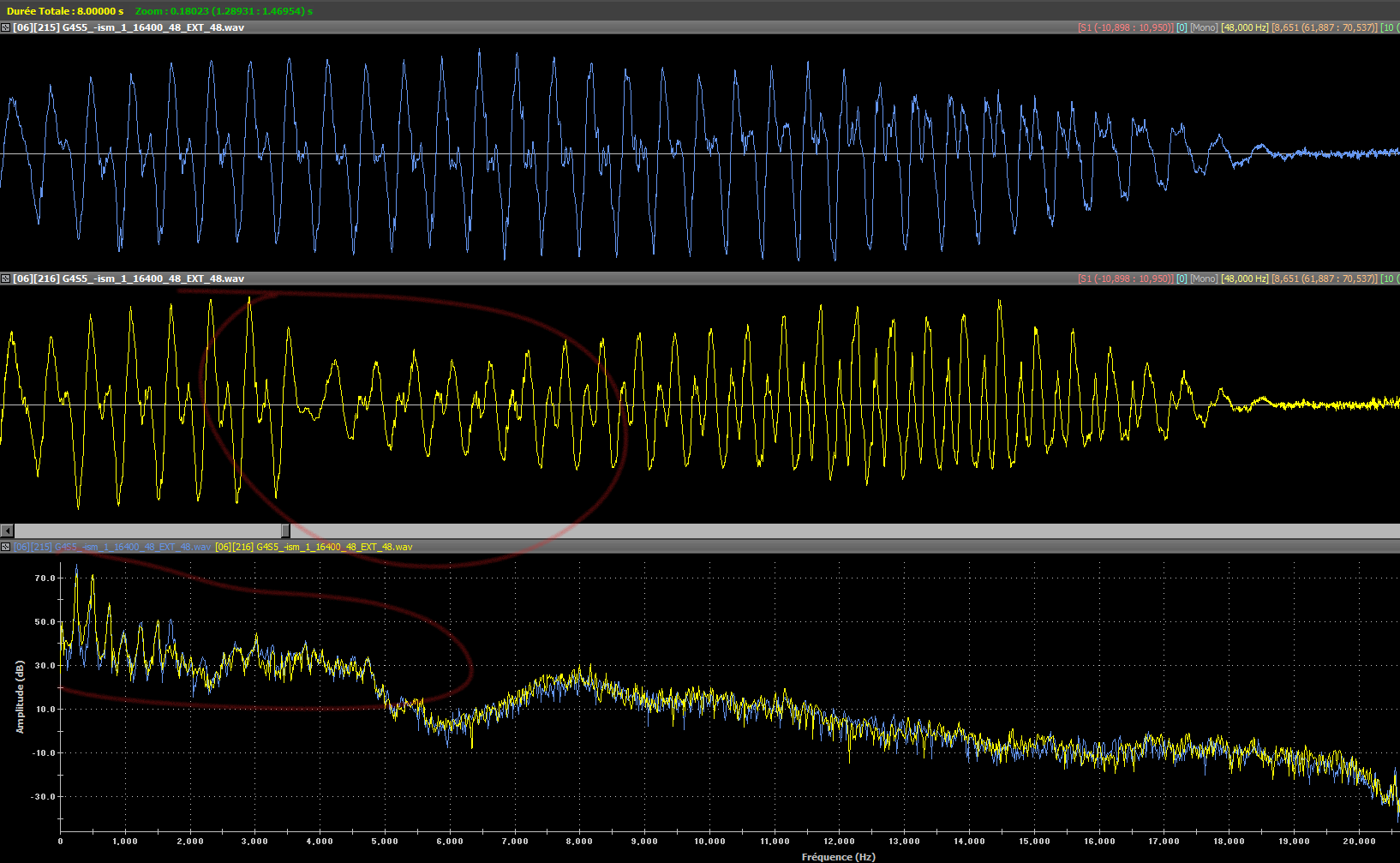 The first 2 images below show probably a transition artefact when switching from one core to another OR a scaling issue. In both cases the time domain signal exhibits a fast change of energy in the fixed point. The 3rd image shows that is way too noisy, even in the LF.