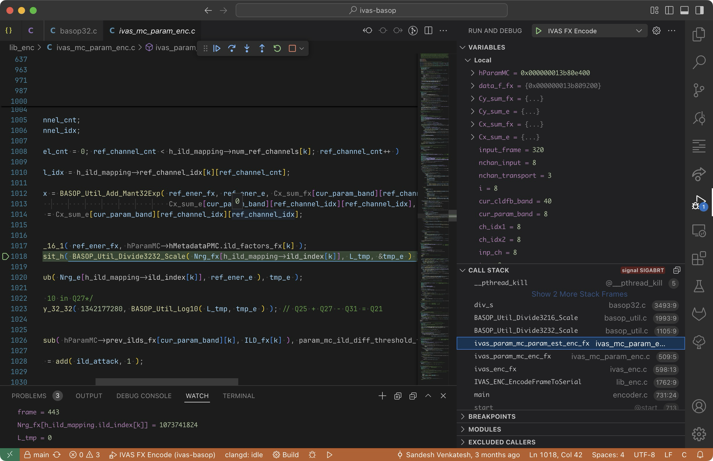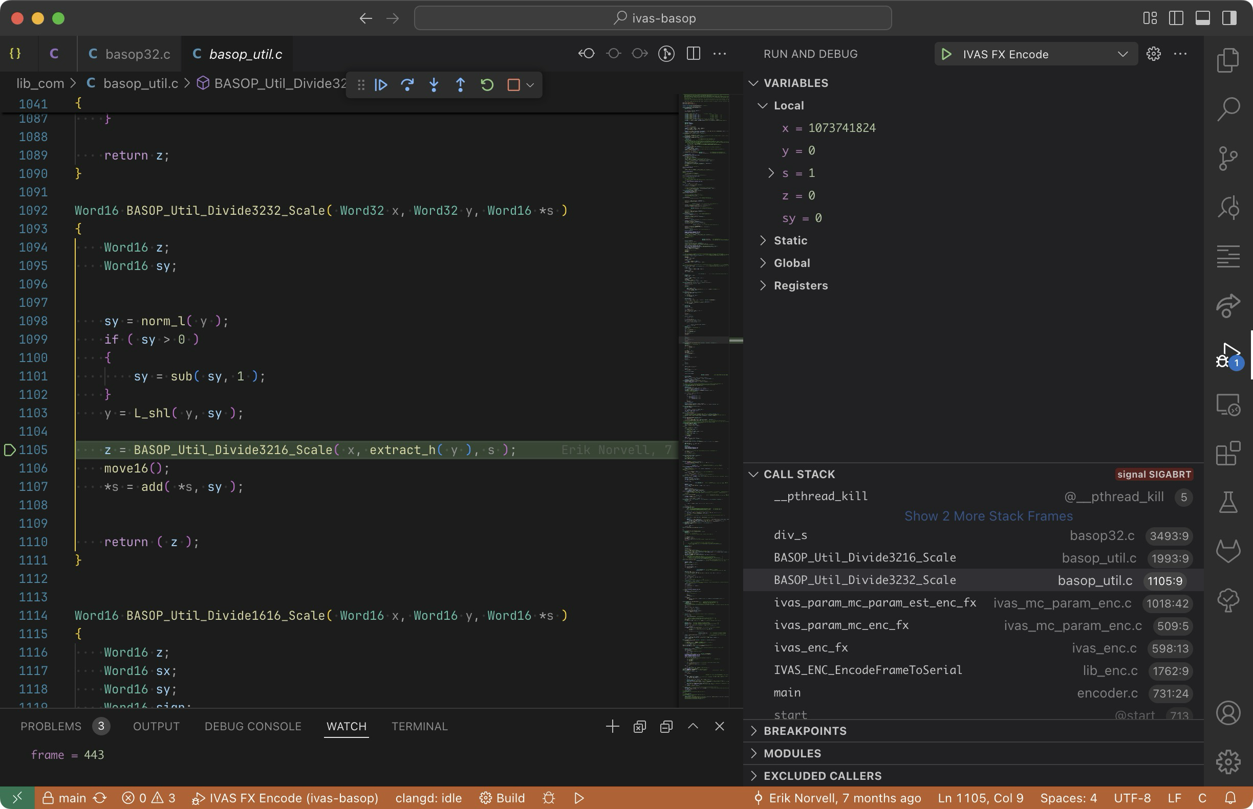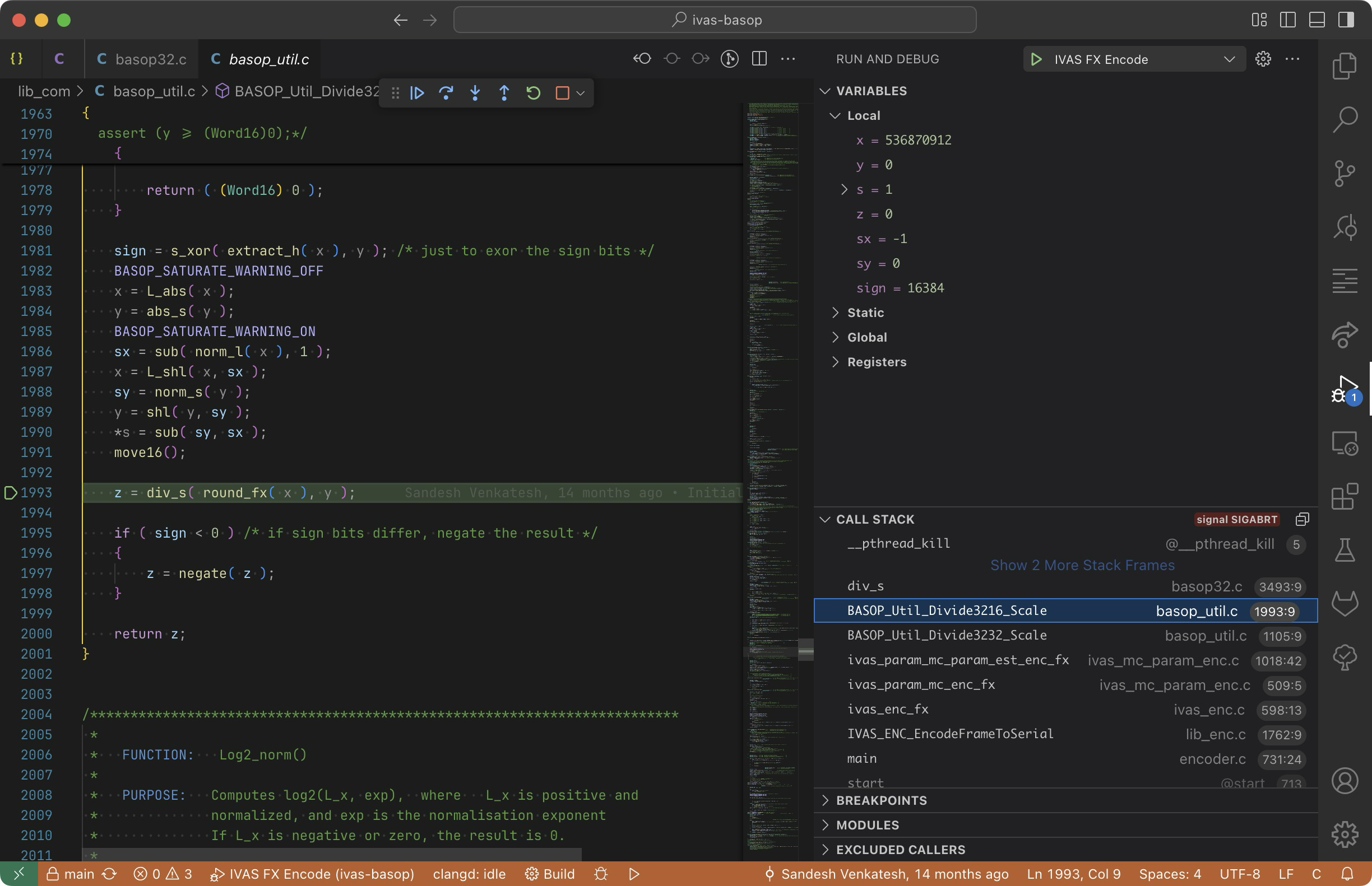The fixed point encoder crashes with an abort in basop32.c:3493 div_s():