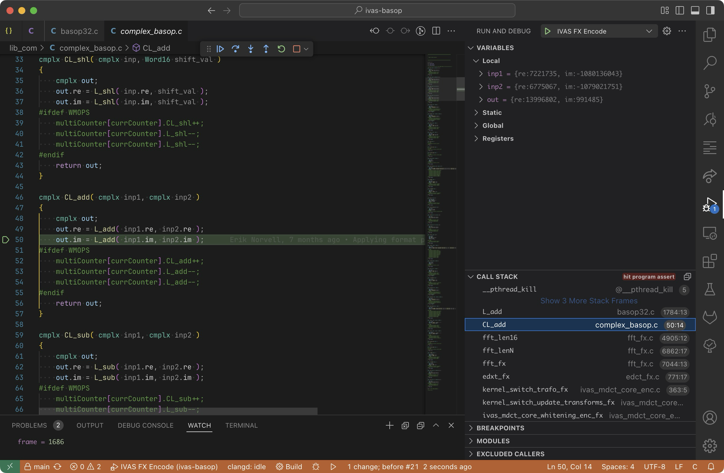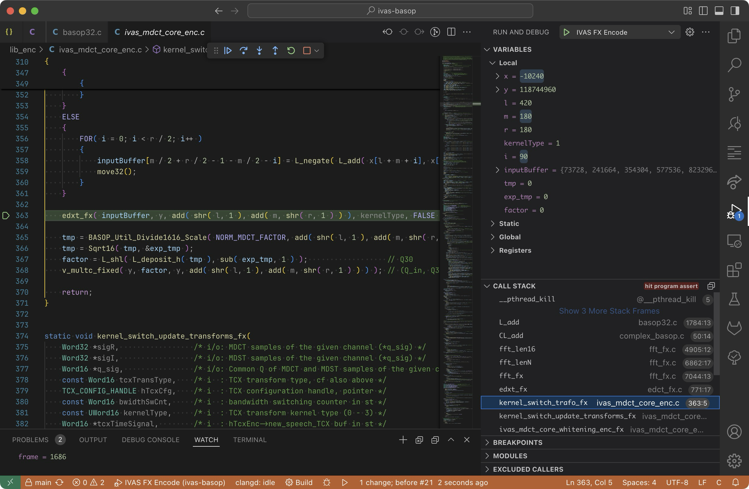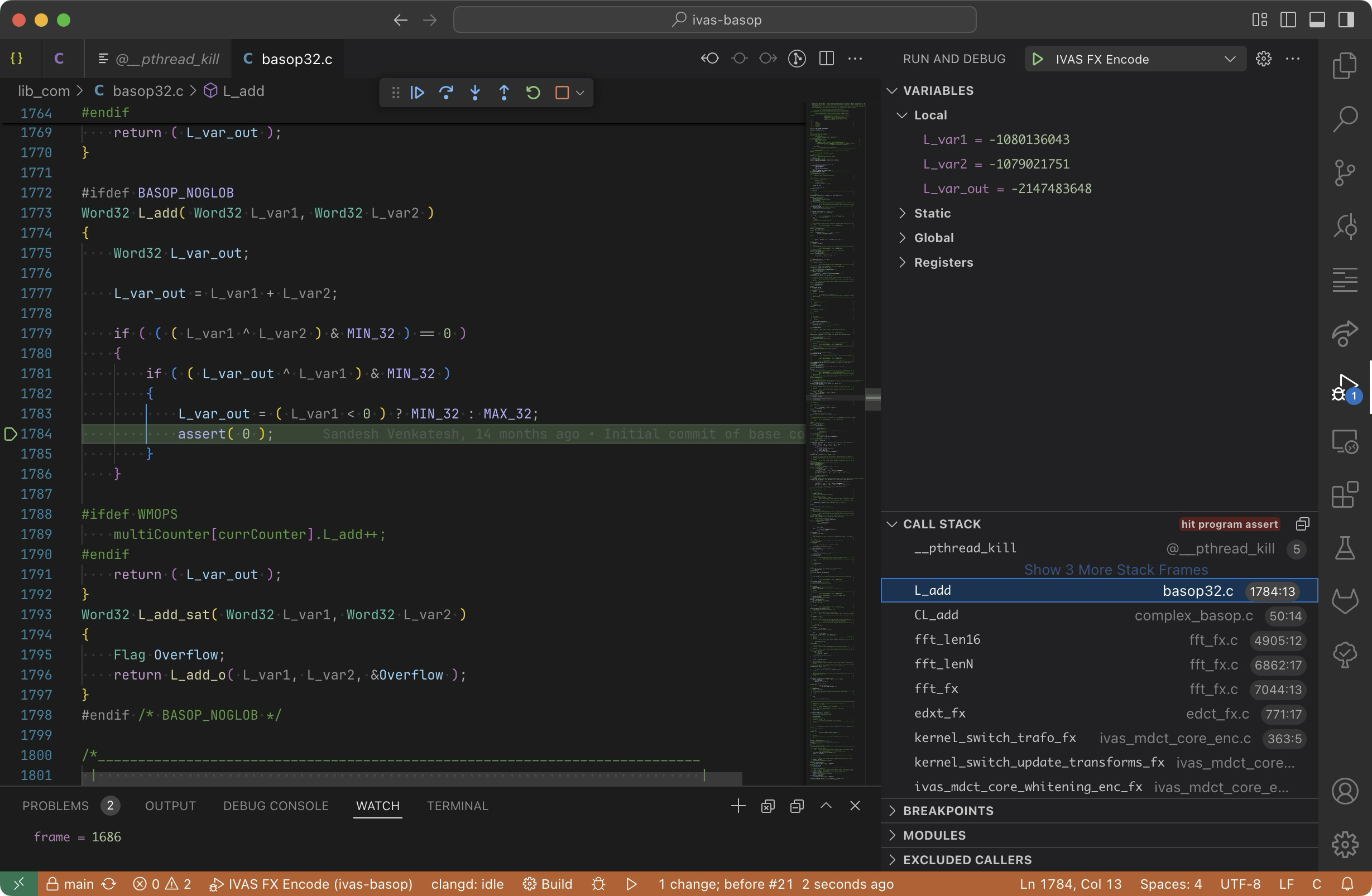 Frames processed: 1535 Assertion failed: (0), function L_add, file basop32.c, line 1784.