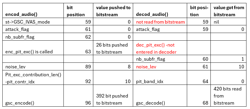 From the above table it can be noted that the noise_level and the nb_subfr_flag values are out of sync. Also, one function dec_pit_exc() is not entered even though the enc_pit_exc() is called in the encoder side.