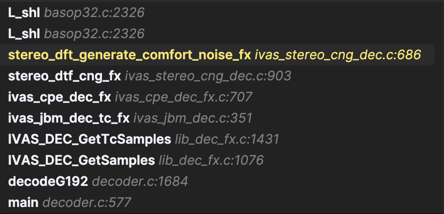The BASOP decoder produces assert in frame 645 when fed with a bitstream from BASOP encoder using MASA input generated from selection test material. Bitrate is 32 kbps and DTX is enabled. The stack trace is here