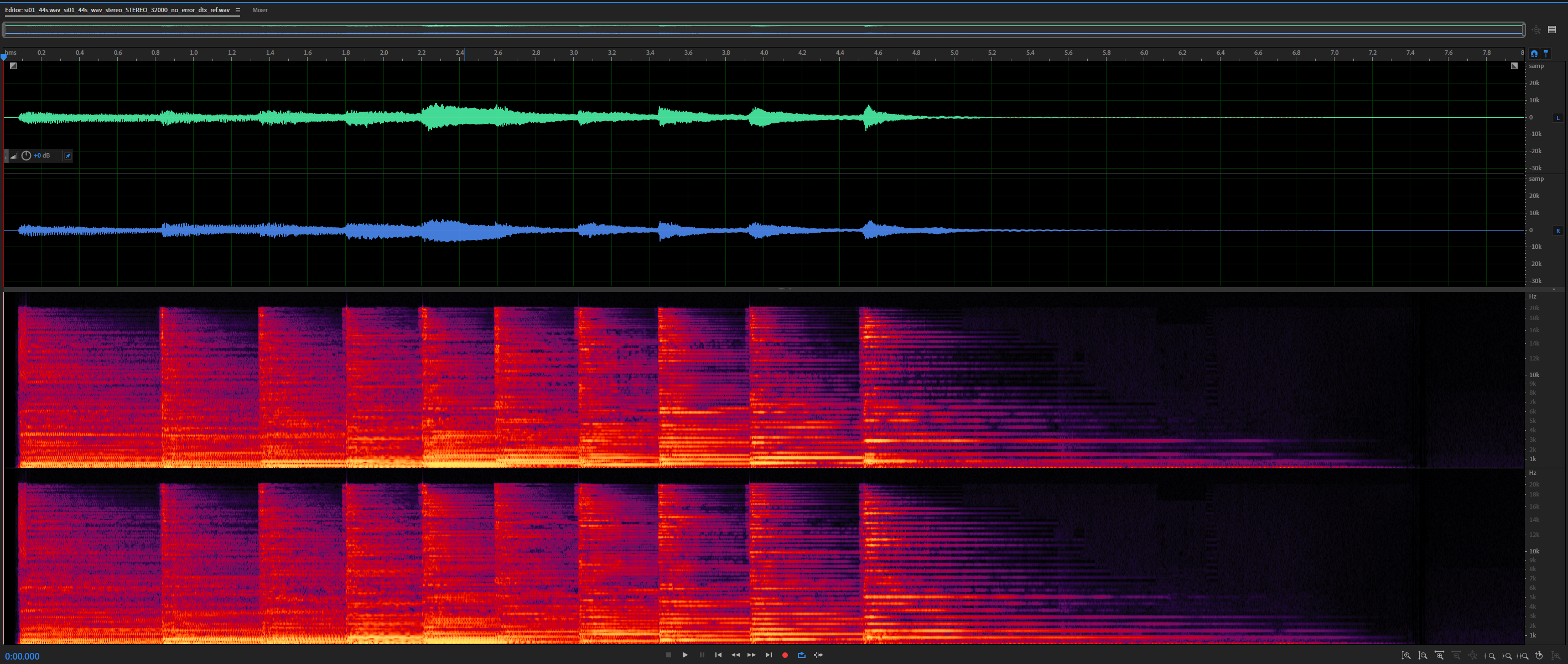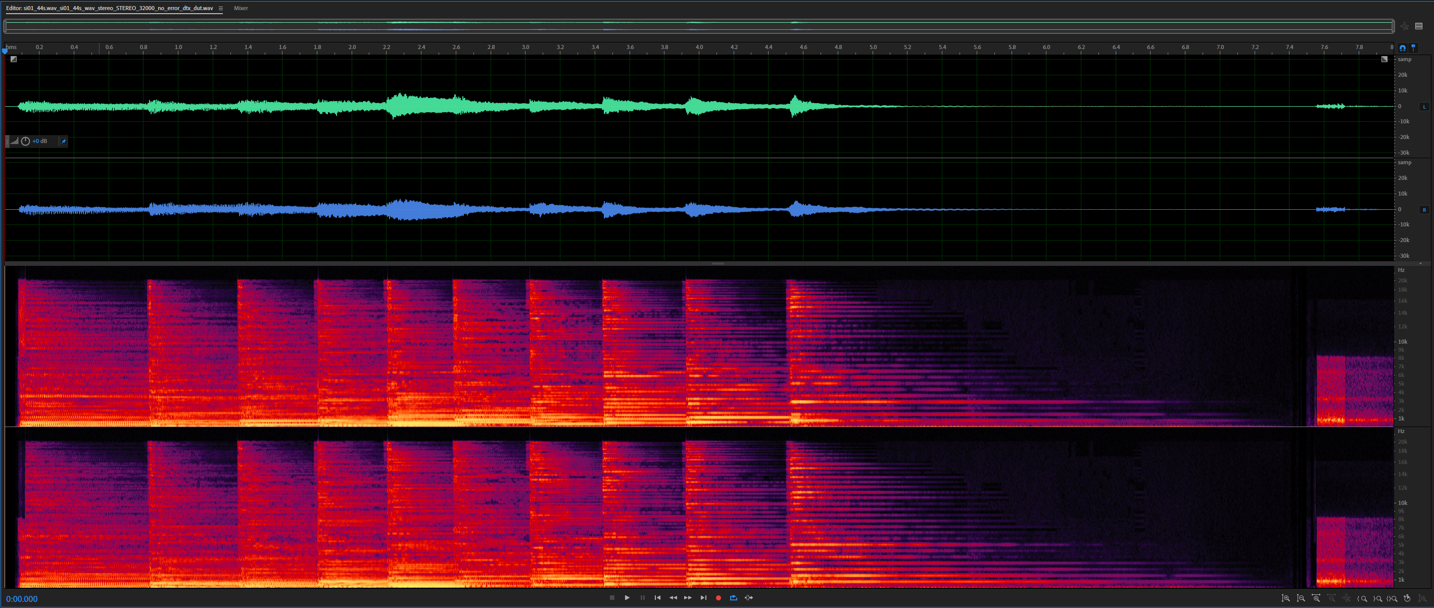 A noise is introduced at the end of the signal (around 7.5s) for a duration of approximately 0.5 seconds between 0 and 8kHz for unified stereo dtx at 32kbps.