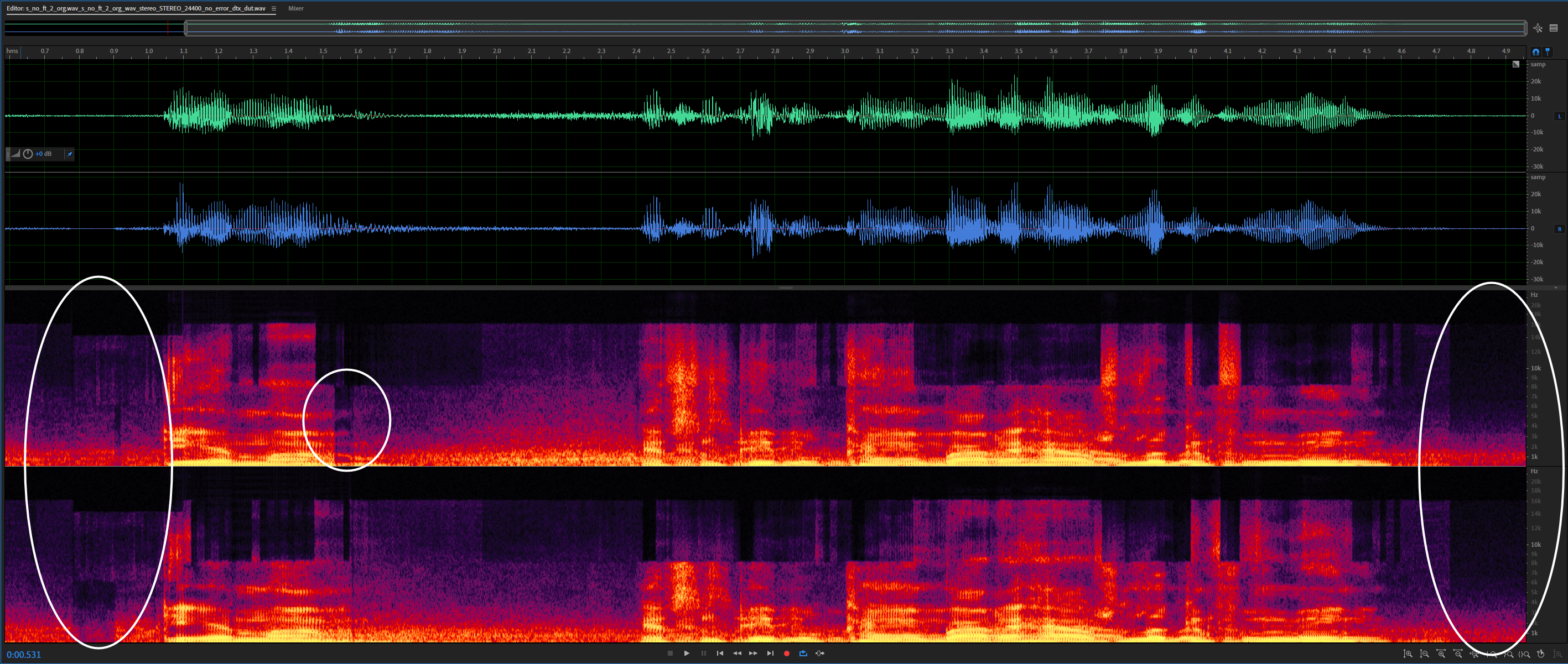 In addition to the spectral holes mentioned in #1246 (closed) between 8-16 kHz, spectral holes are also observed for the frequency range 2-4 kHz, for unified stereo DTX on/off at 24.4kbps. Other spectral differences are observed for frequencies higher than 4 kHz at the end of the segment.