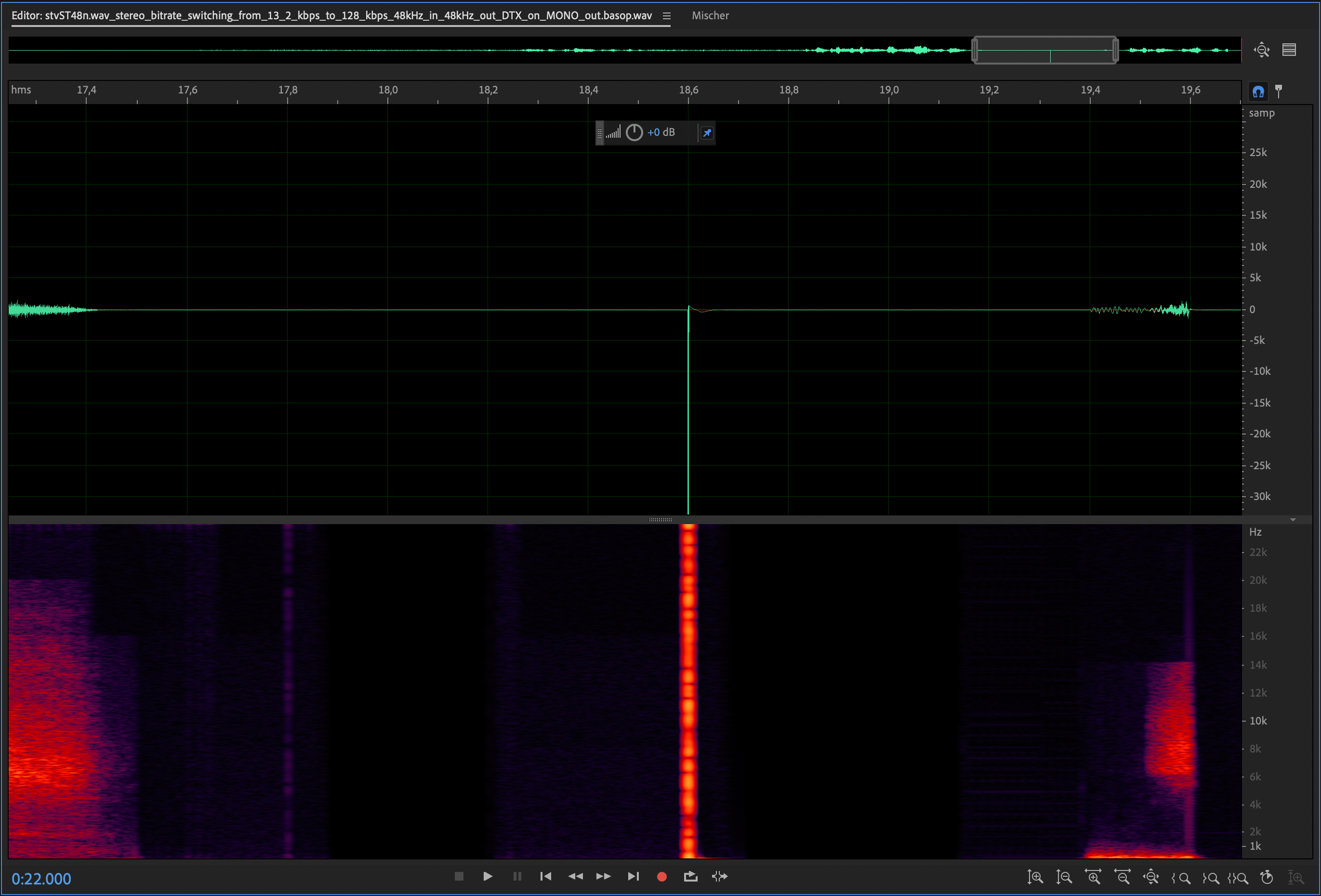 Decoding the attached bitstream (DTX, bitrate switching, DMX to mono) with the BASOP decoder results in a severe click-artifacts at 18.6s (frame 930). See the following screenshot: