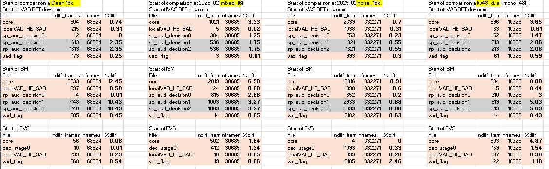 In general, the first stage speech/music selection between float and fix seems to work well and have consistent number when compared to the EVS float/fix performances. On the other hand, the 2nd and 3rd level (sp_aud_decision1 and sp_aud_decision2) show a more deviation which lead to a greater deviation of the core selection as well.