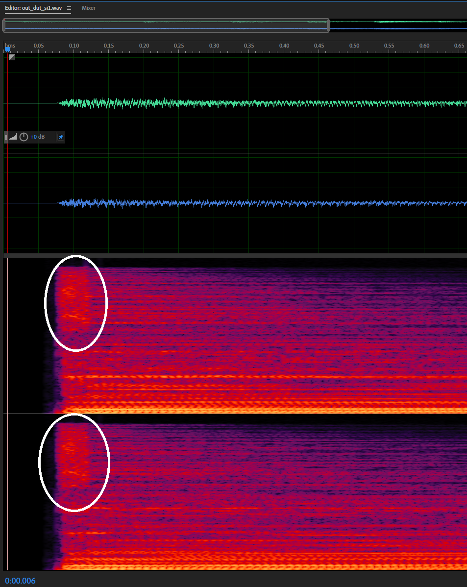 There is a distortion at the beginning between 0.08 and 0.12 seconds. It is visible in high frequency band, starting from 8 kHz. The issue is present both when DTX is on/off.
