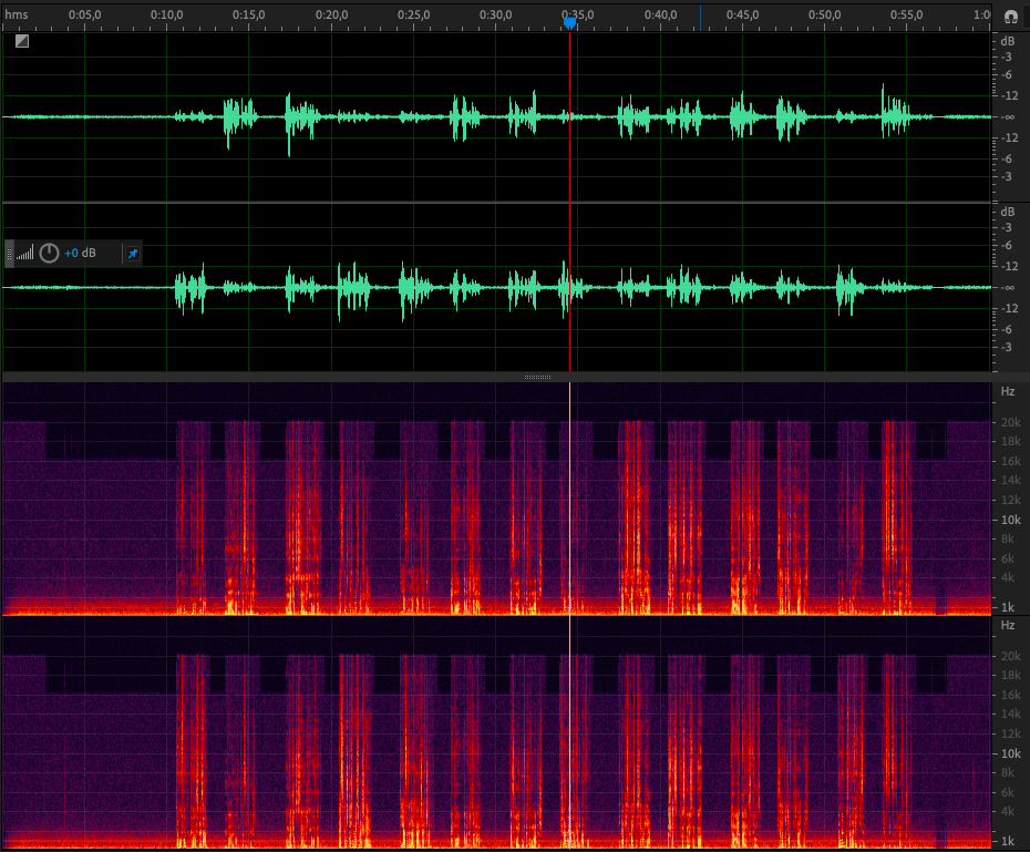 The basop encoder in stereo mode at 80kbps does not trigger dtx for this testcase while the float reference encoder does. In the below spectrograms, one can easily spot the dtx portions via the band limitation in the float -> float output.