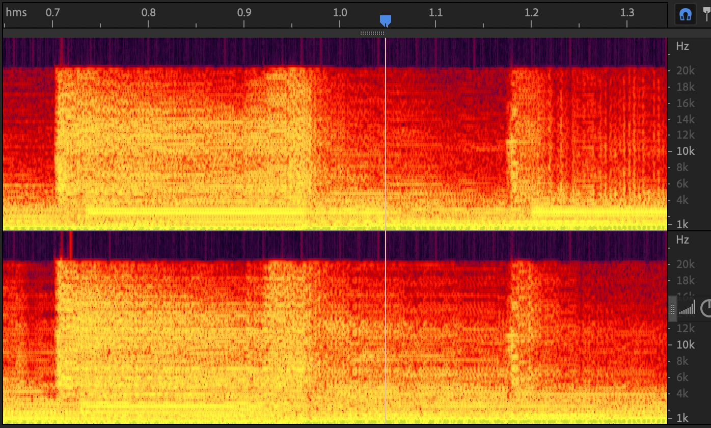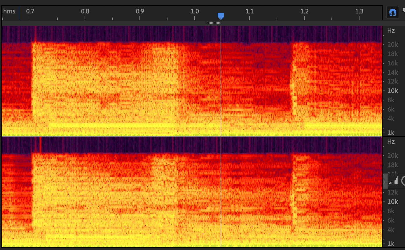 For e.g. frame 0.820 s one can clearly see the attenuation for the said frequencies and then for the upper frequencies float and BASOP diverge: