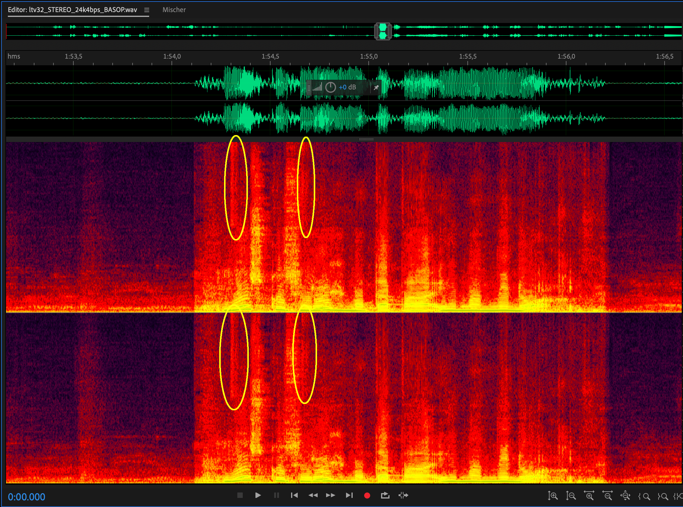 For stereo encoding of 24.4 kbit/s, there are BWE energy "bursts" visible, which aren't there in float. For the 32 kHz LTV it's at 1:54.3 and 1:54.66