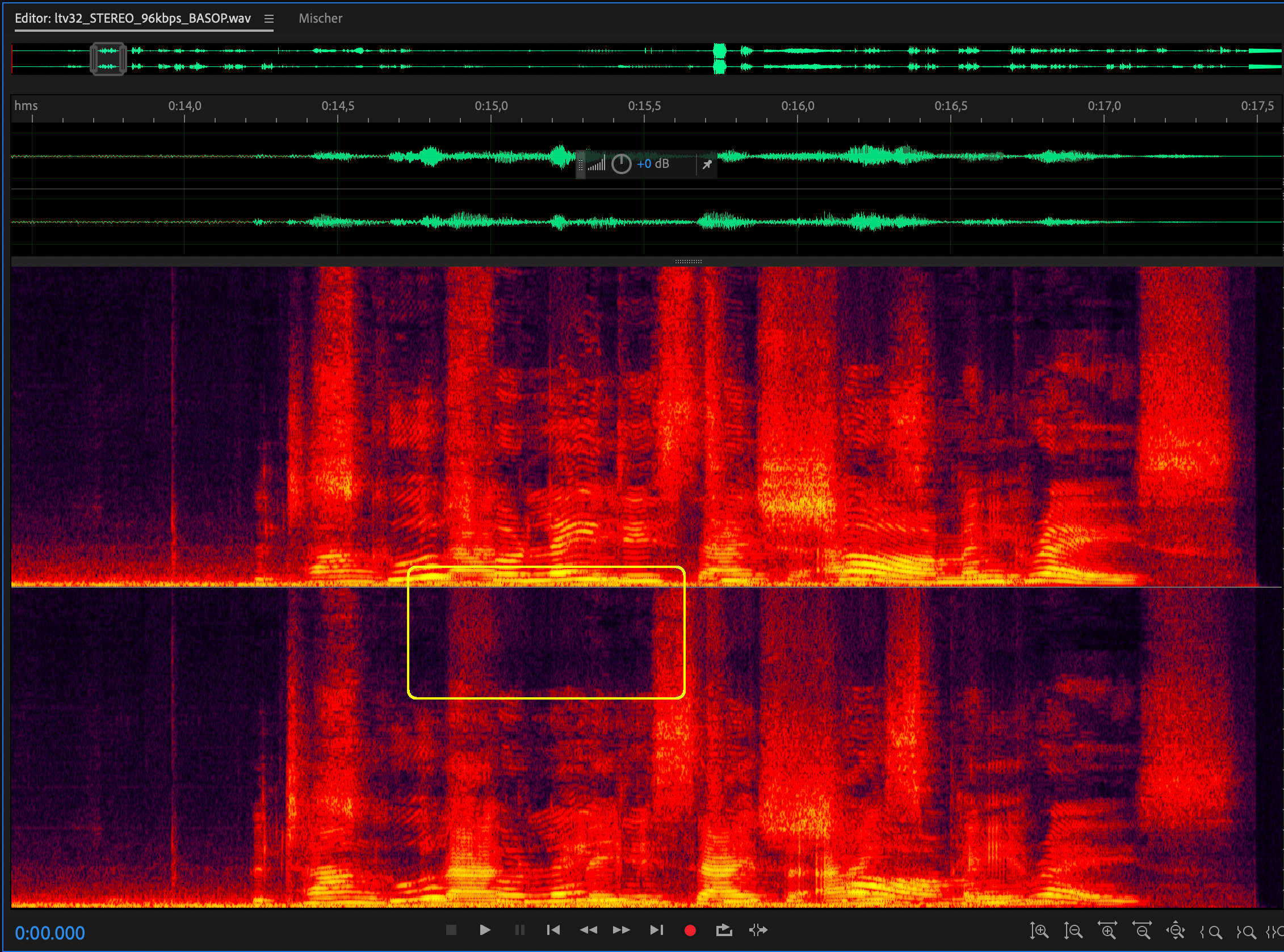 There are sometimes smaller differences visible in the IGF region for stereo that look, as if a different whitening level has been used in BASOP instead of float. E.g. for 32 kHz LTV, at 0:14.9: