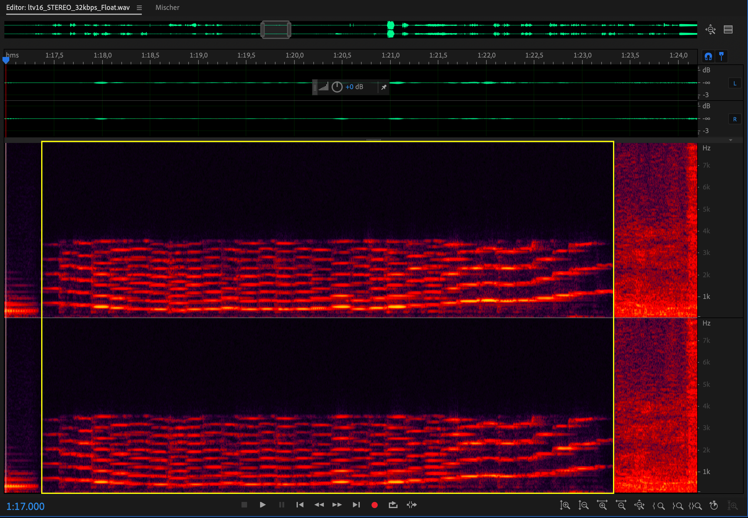 For the violin part in the LTVs (starting at 1:17.35), the BASOP encoder choses a different transform-coder mode than the floating-point code, leading to a significant degradation of the coded signal. Starting from frame 3853, the BASOP encoder switches to HQ_CORE, where Float sticks to TCX20.
