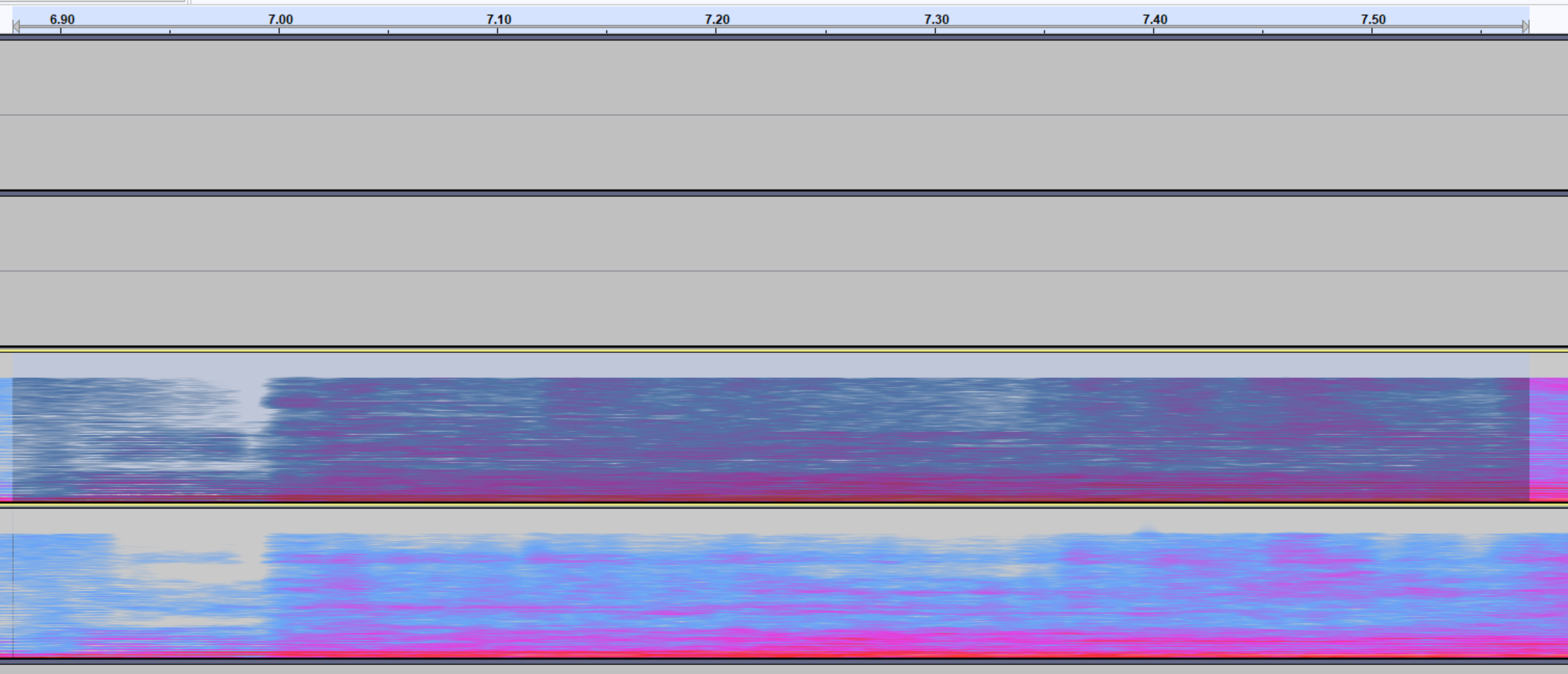 The W channel in the EXT output (and consequently the other Ambisonics channels) wound dull and distorted at around 7 s. The spectrogram shows missing HF energy and different features. Shown are float (top) and BASOP (bottom).