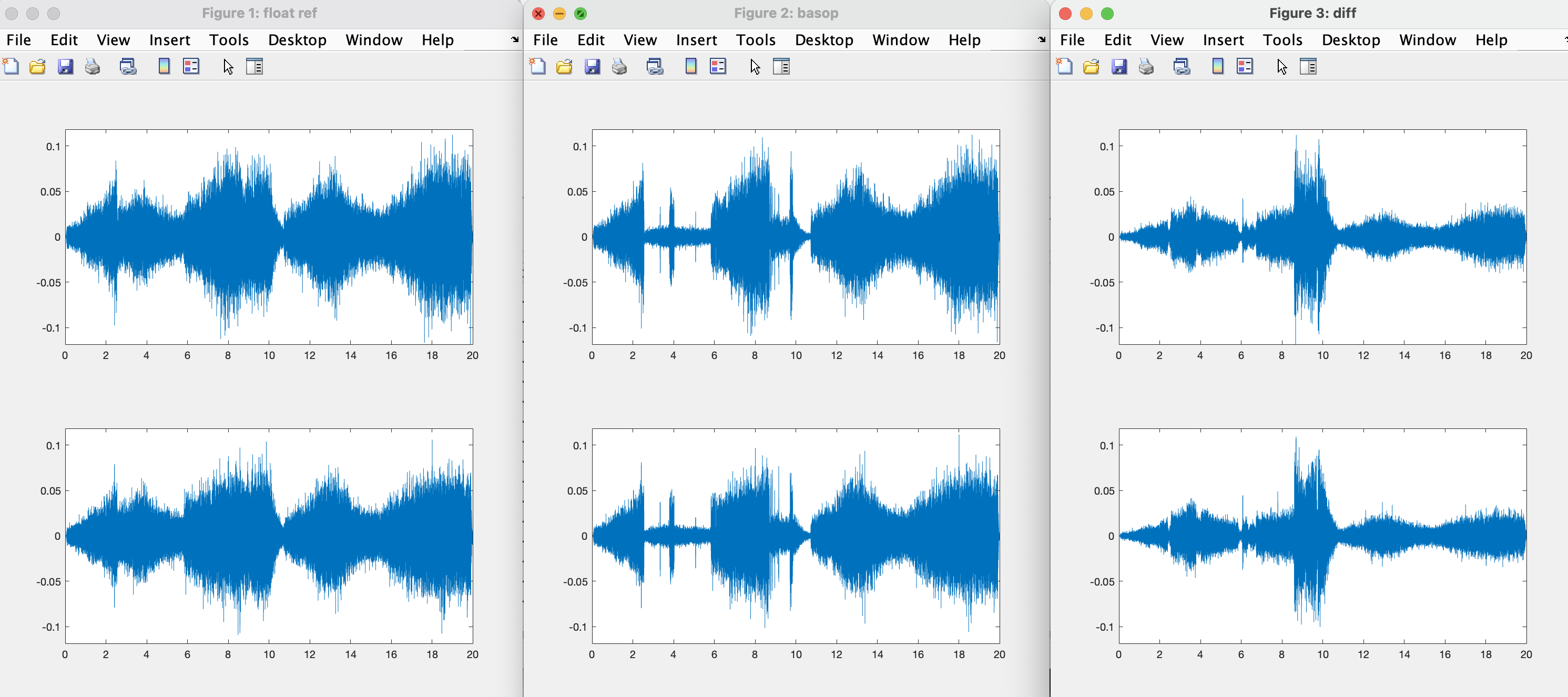 For a specific noise sample, there seems to be a significant difference how the signal is encoded by the BASOP encoder and the float encoder. See figure below