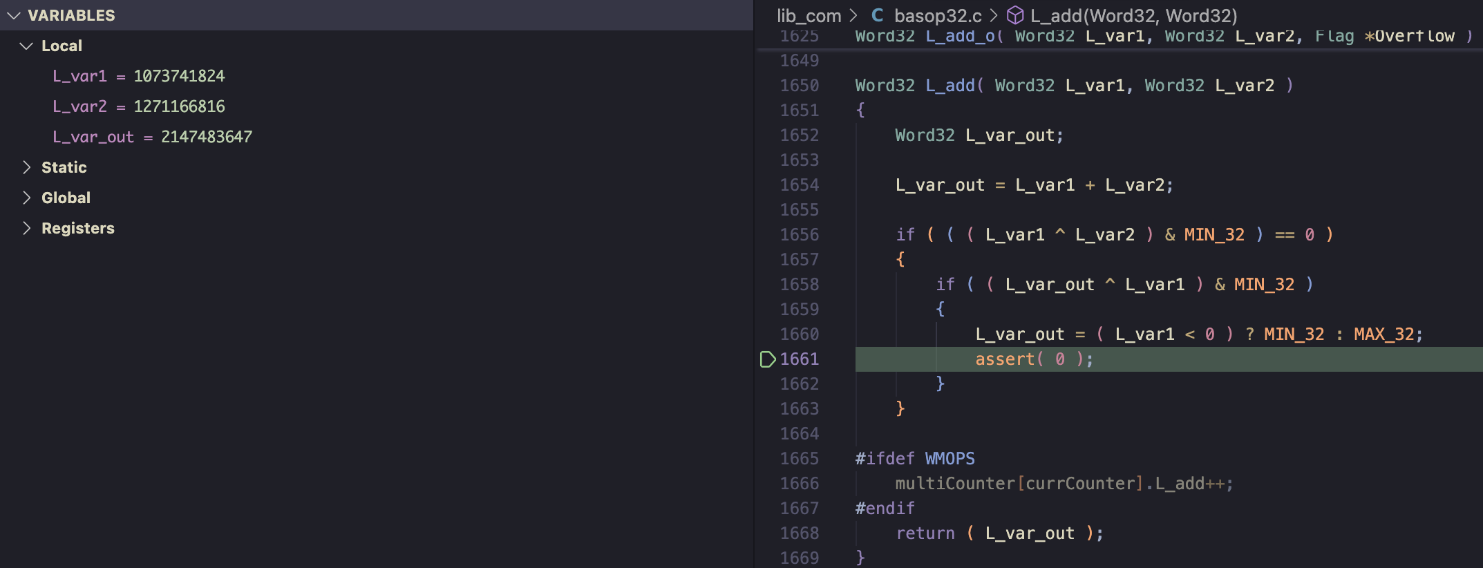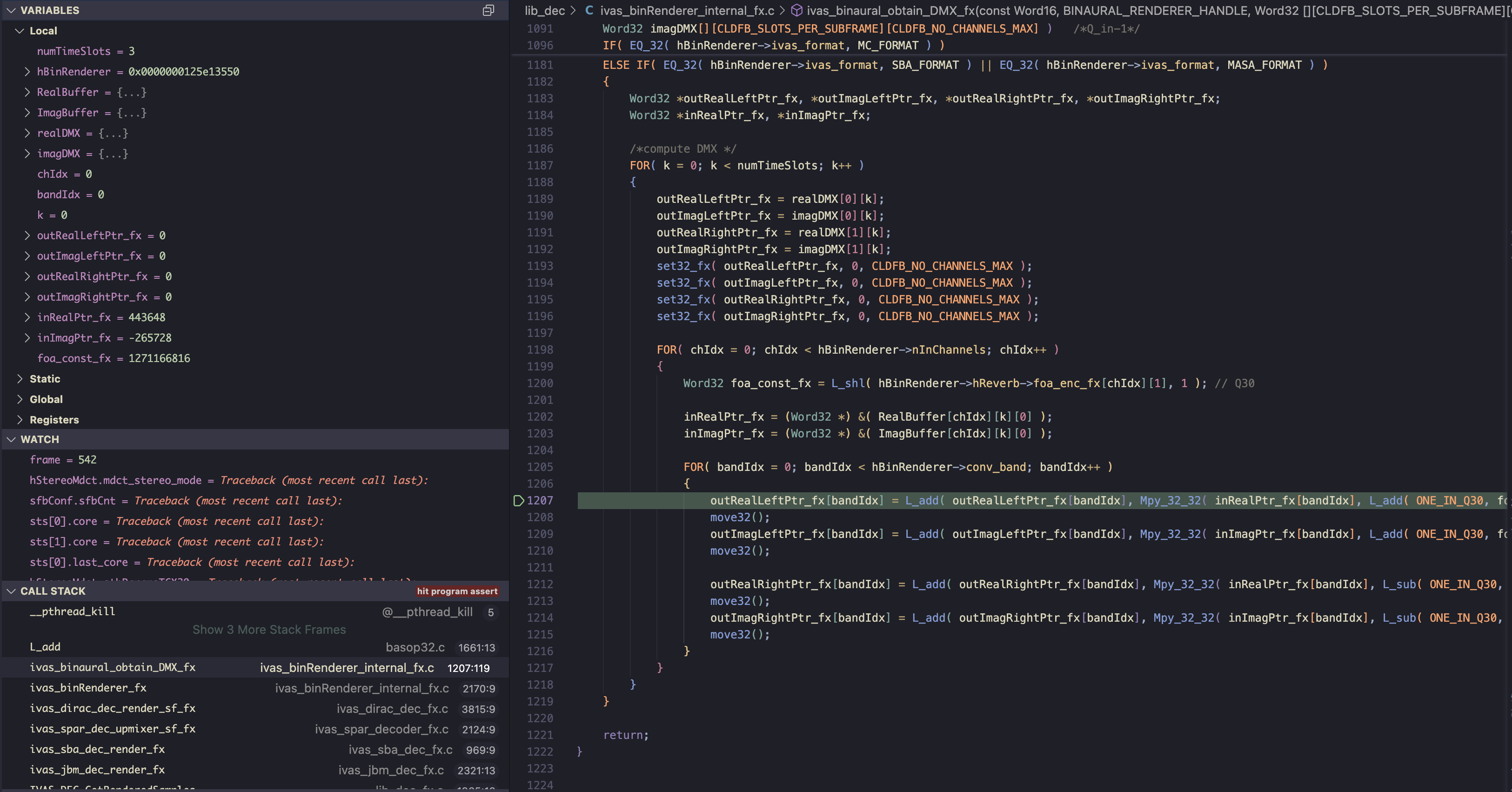 The second L_add call in this line (L_add( ONE_IN_Q30, foa_const_fx )) causes the crash: