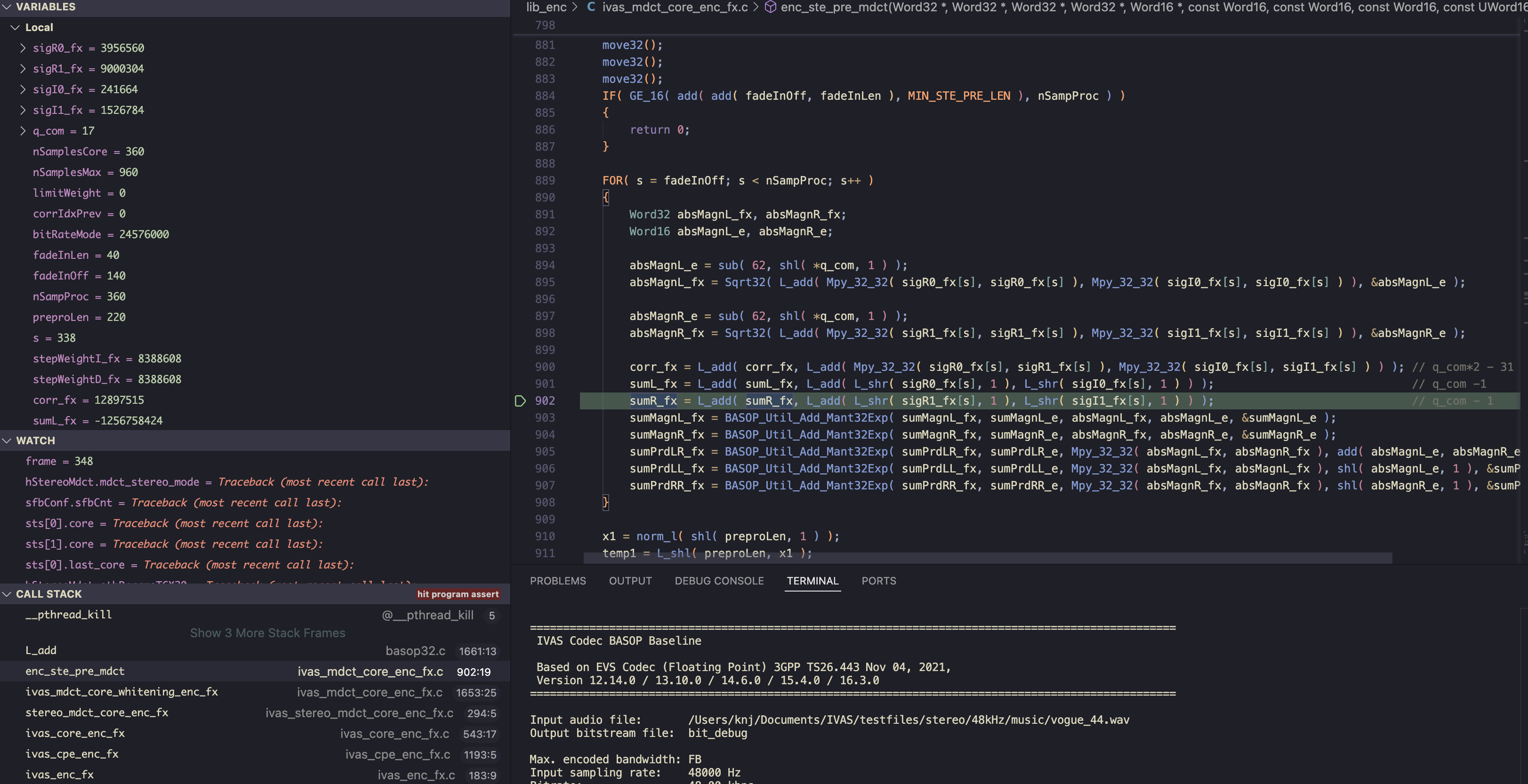 Problem happens in frame 348 in the outer L_add call at lib_enc/ivas_mdct_core_enc_fx.c:902: