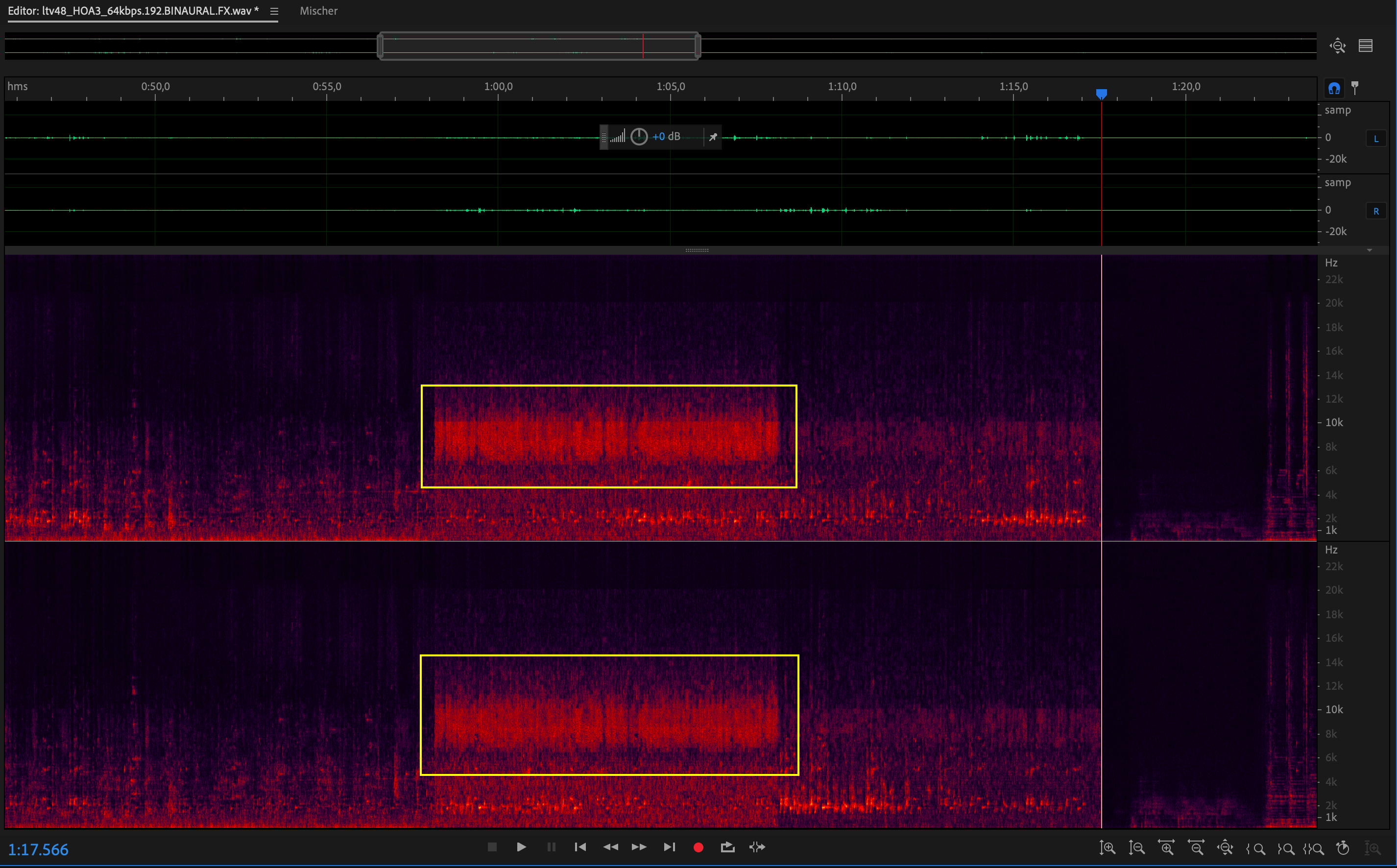 Decoding the SBA LTV bitstream at 64 kbit/s (and also 48 kbit/s) with binaural rendering gives relatively large differences on the noisy signal portion (0:58 - 1:08).