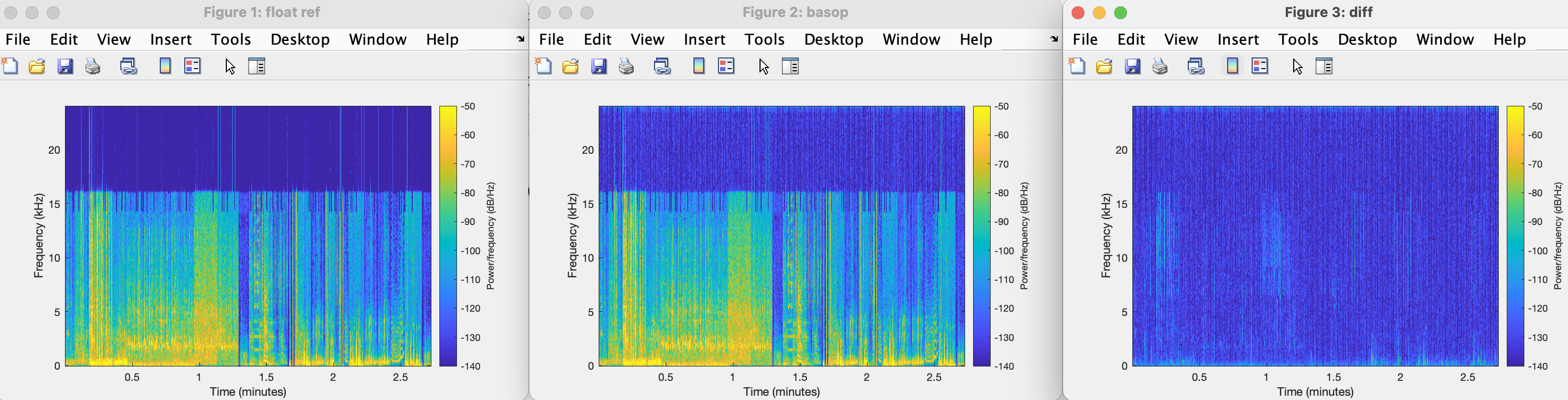 There is a bit of an outlier MLD score of about 8 for float ENC to BASOP DEC with McMASA and rate switching with rendering to MONO (so direct downmix of transport channels). In the same processing set, other mode combinations produce maximum of 2 MLD with BASOP decoder. The spectrogram is this but cases having lower MLD have pretty similar spectrogram and diff.