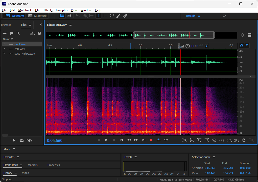 The castanets test sample rendered lower level for float compared to BASOP for the last two beats. It turns out that BASOP is closer to the input signal, which is why this is labelled a float reference issue.