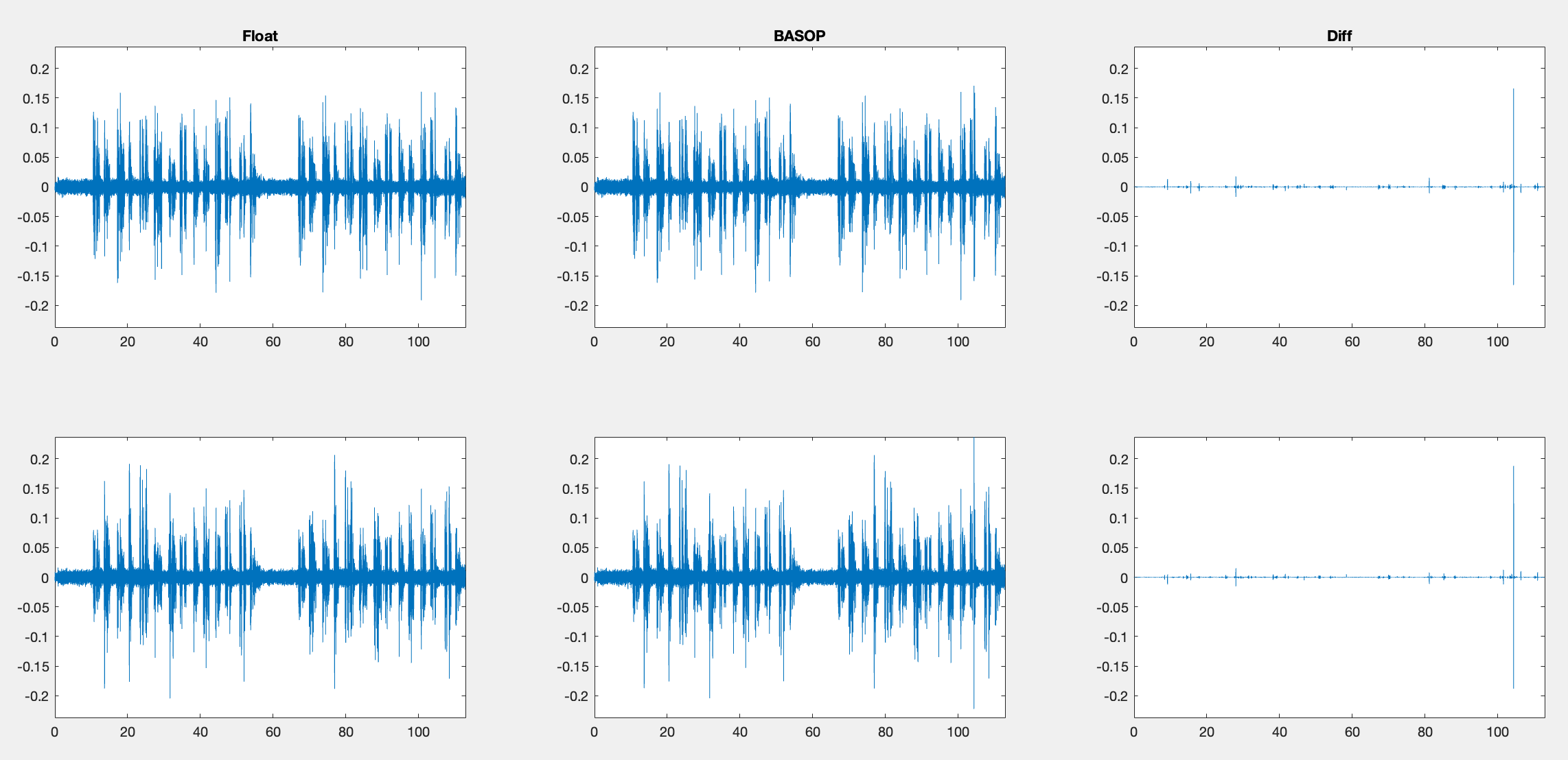 Specifically with float encoder to BASOP decoder, this rate switching case has a severely emphasized switching artifact towards the end of the file. See figure below.