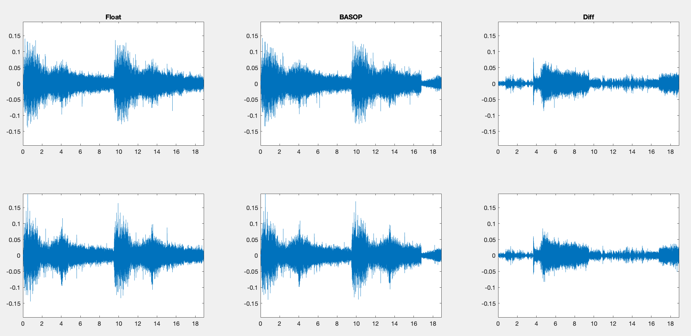 Here is time domain plot of full float vs. BASOP enc to float dec.