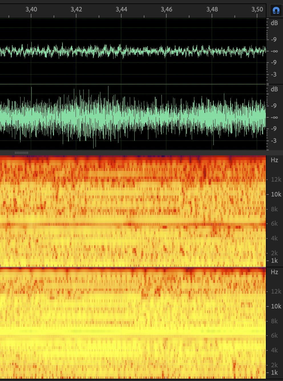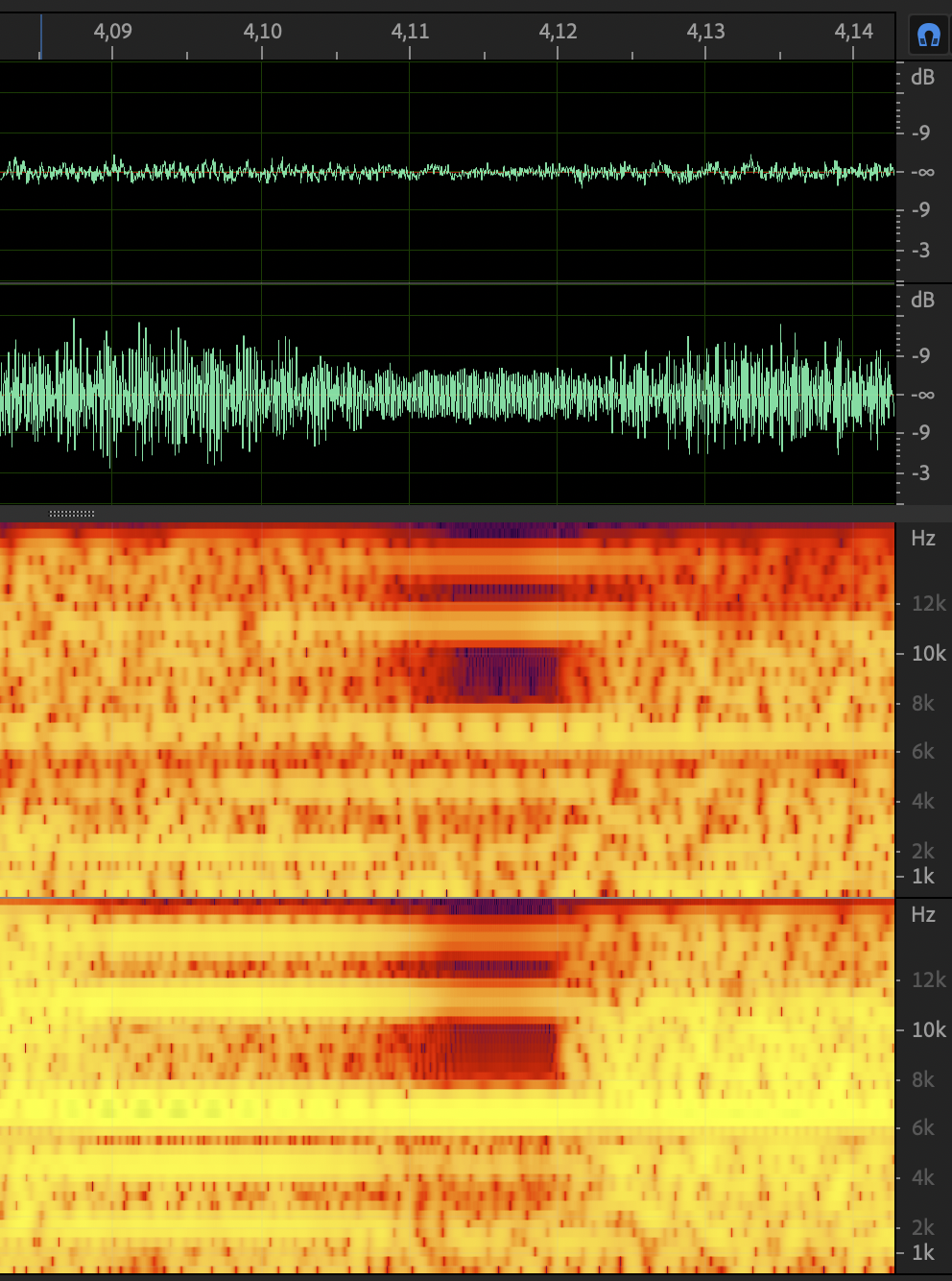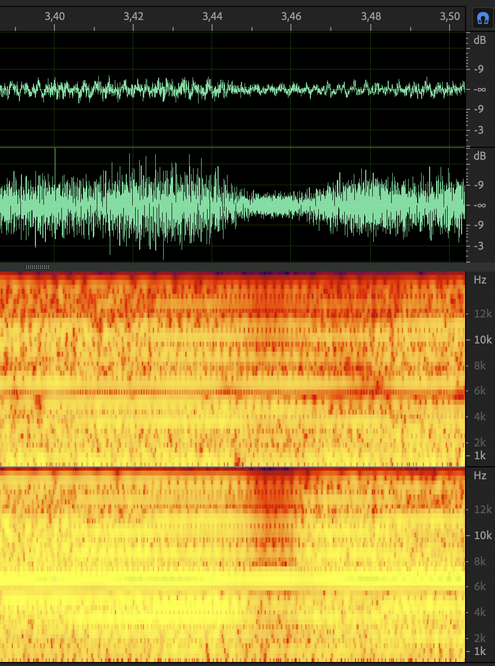 In this selection test stereo item coded at 13.2kbps, the BASOP-encoded output has some (sub)frames with missing energy, for example at about 5.0s: