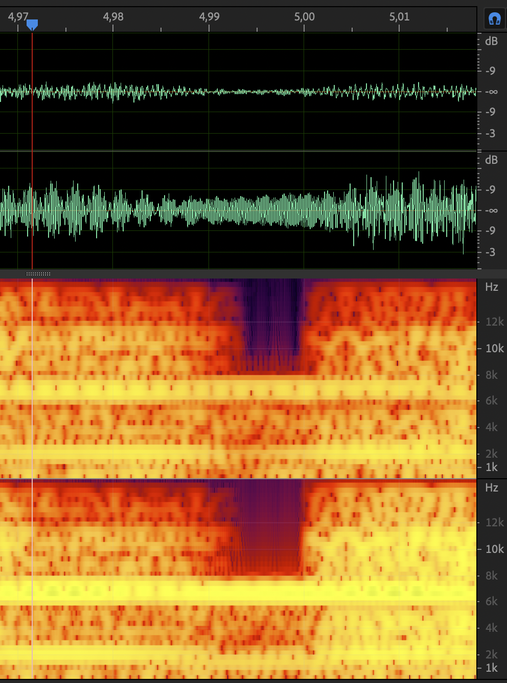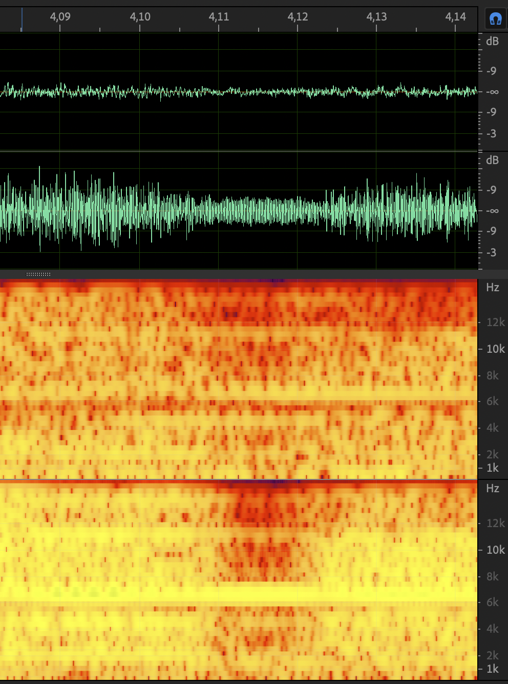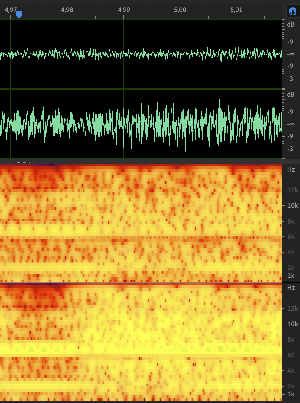 In this selection test stereo item coded at 13.2kbps, the BASOP-encoded output has some (sub)frames with missing energy, for example at about 5.0s: