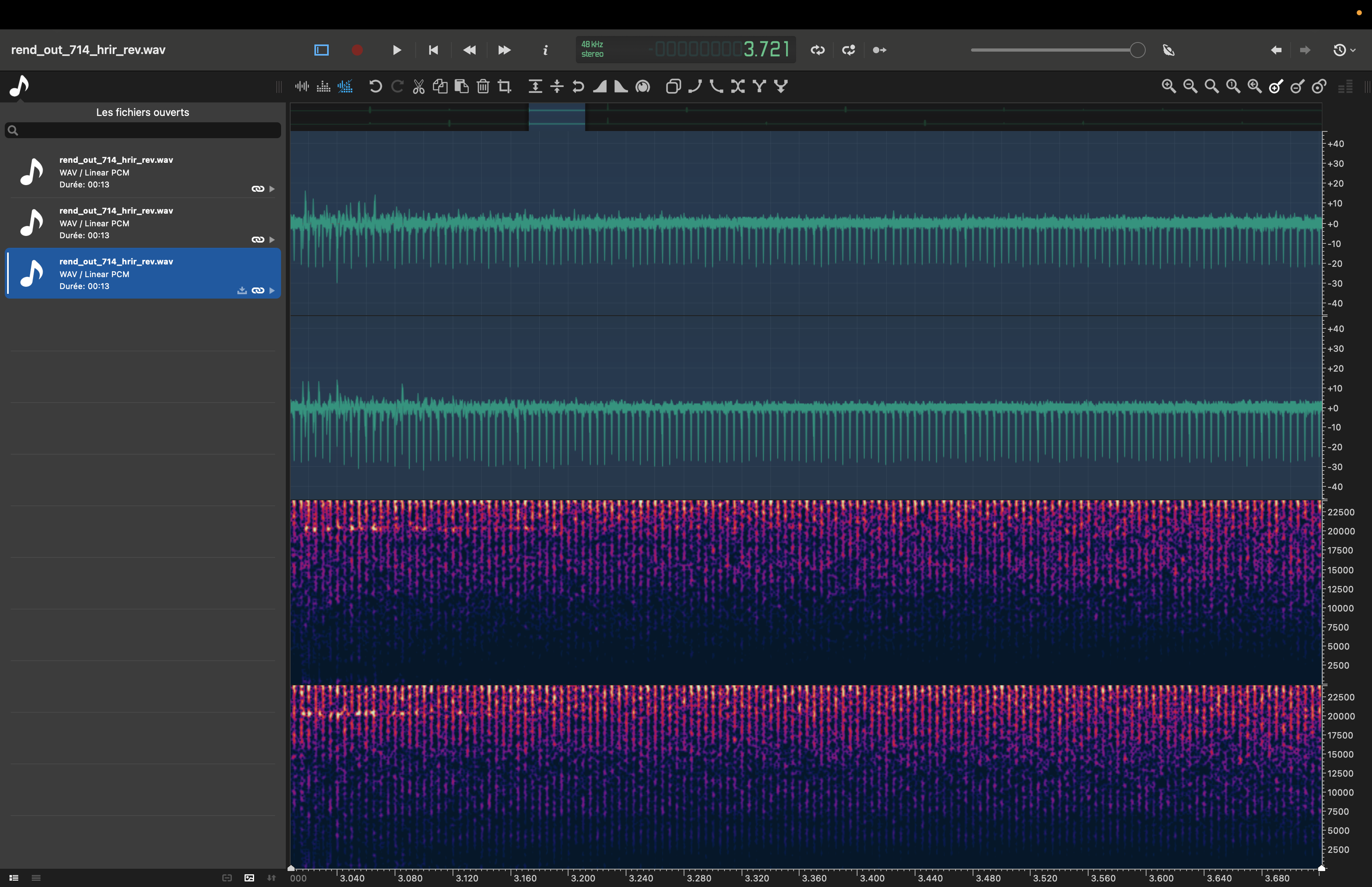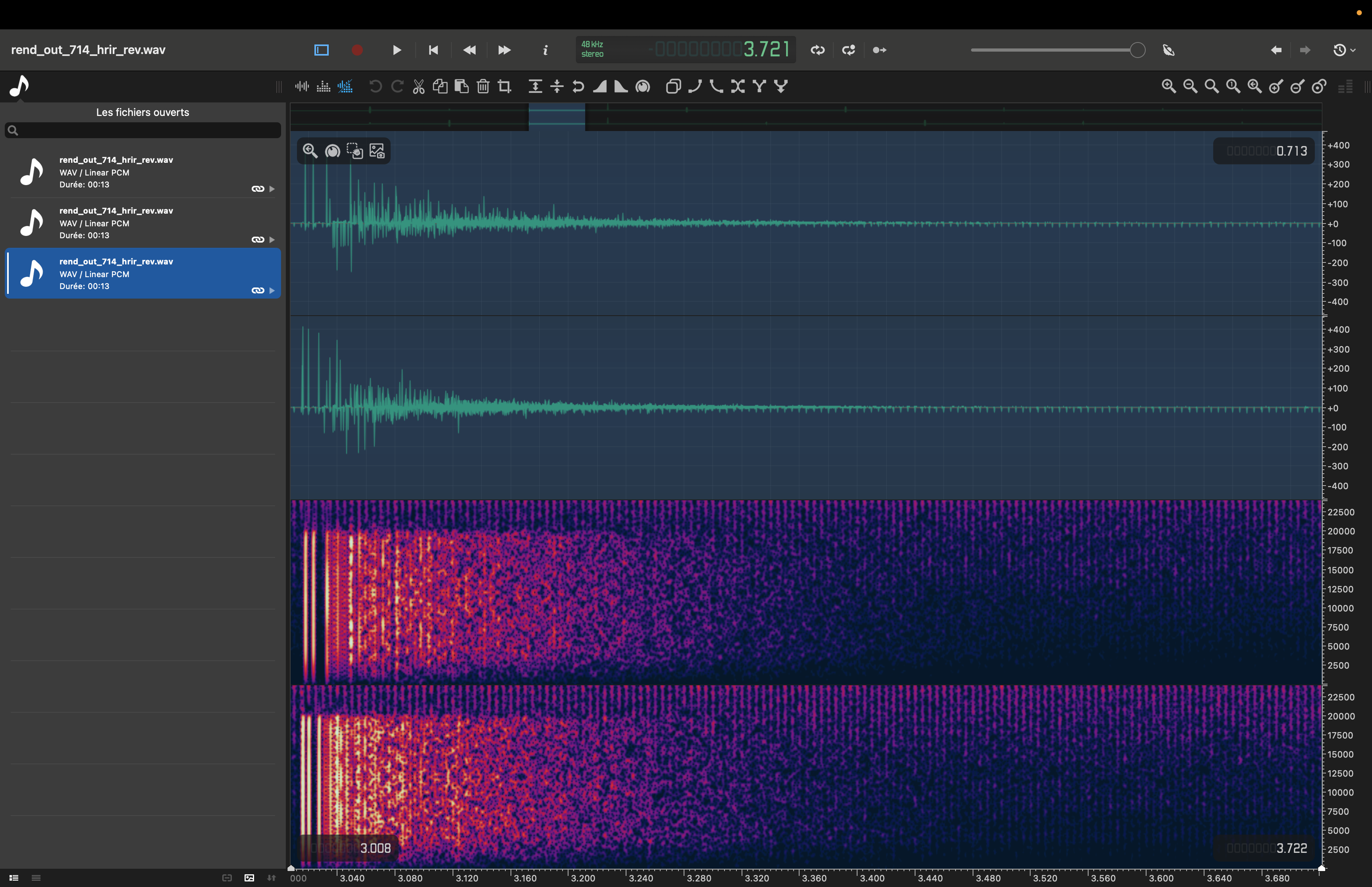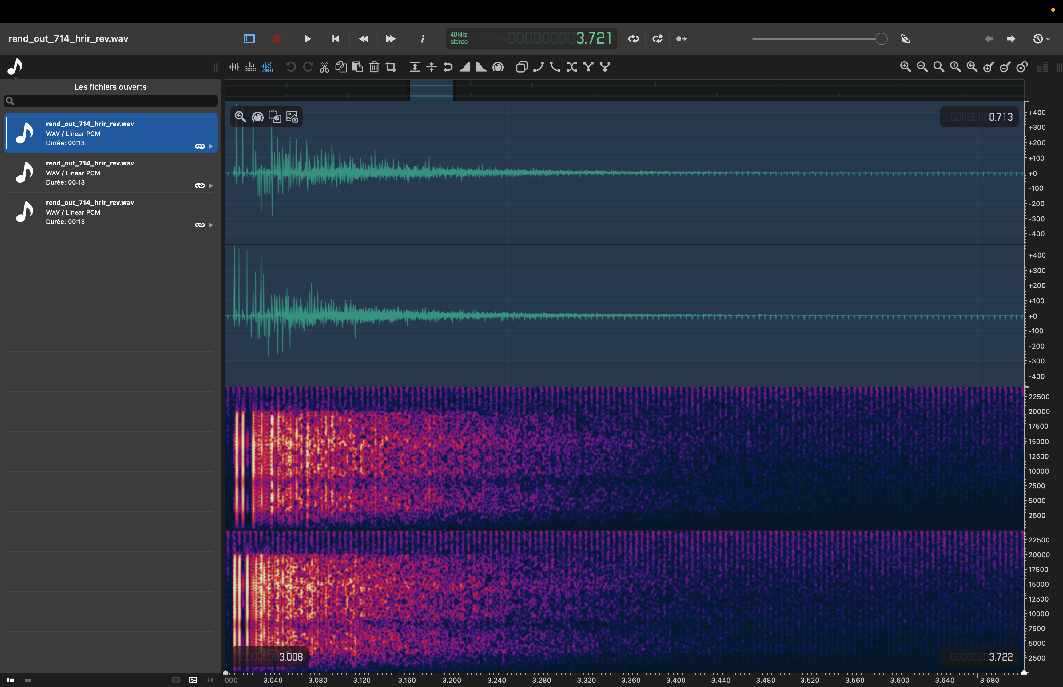 At 48 kHz, putting a wave file with delayed impulses on each channels, using command hereunder for each branch and zooming on late part of of one BRIR we get the following image. An high frequency noise is present on main and main-pc branchs