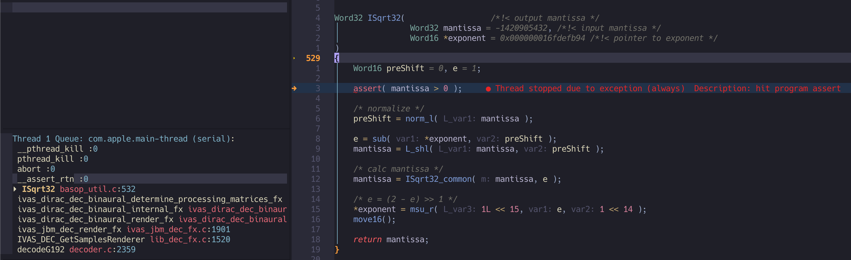 Frames processed: 2815 Assertion failed: (mantissa > 0), function ISqrt32, file basop_util.c, line 532.