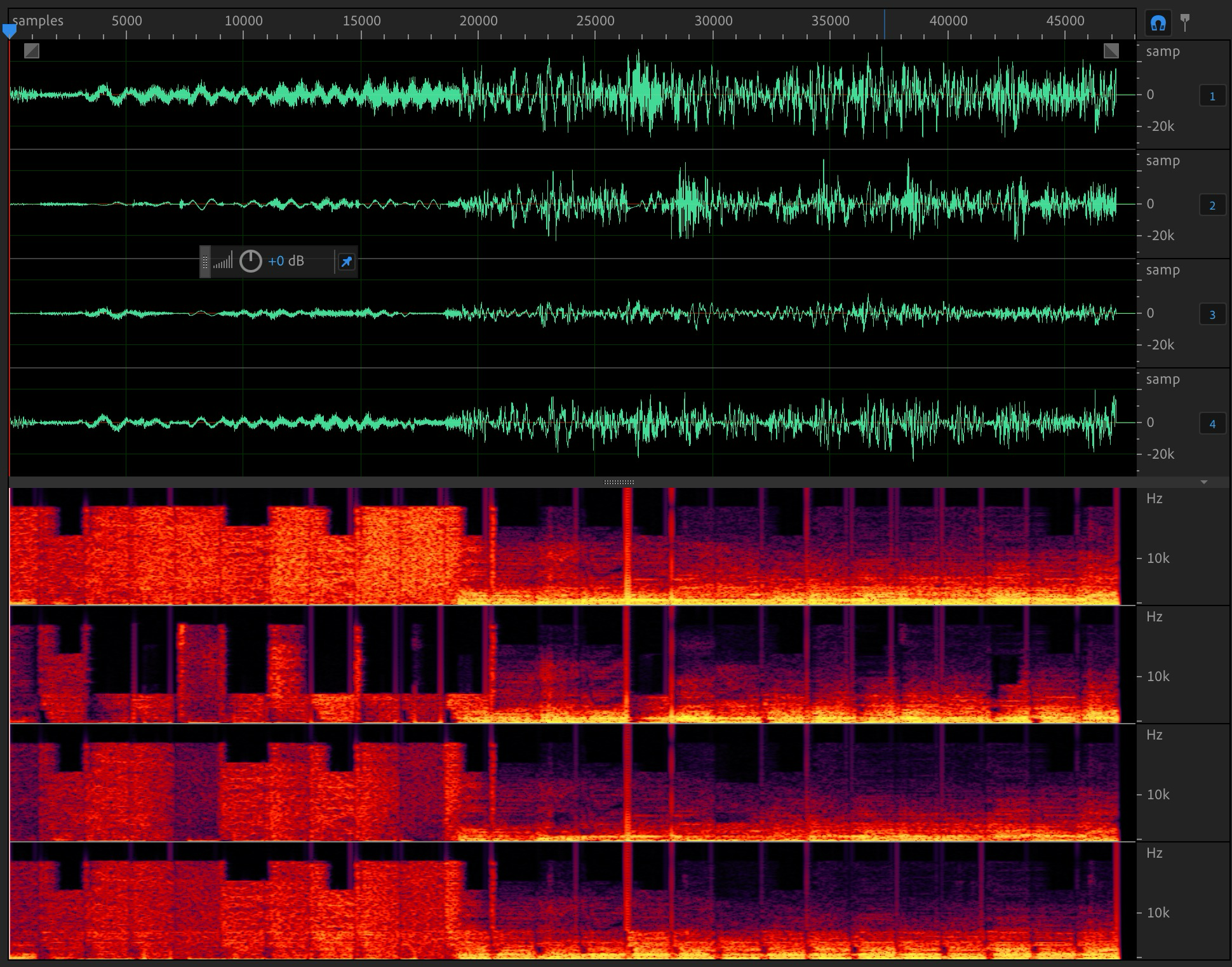 This is easiest to see when the output is switched to FOA (noise burst near sample ~6500):