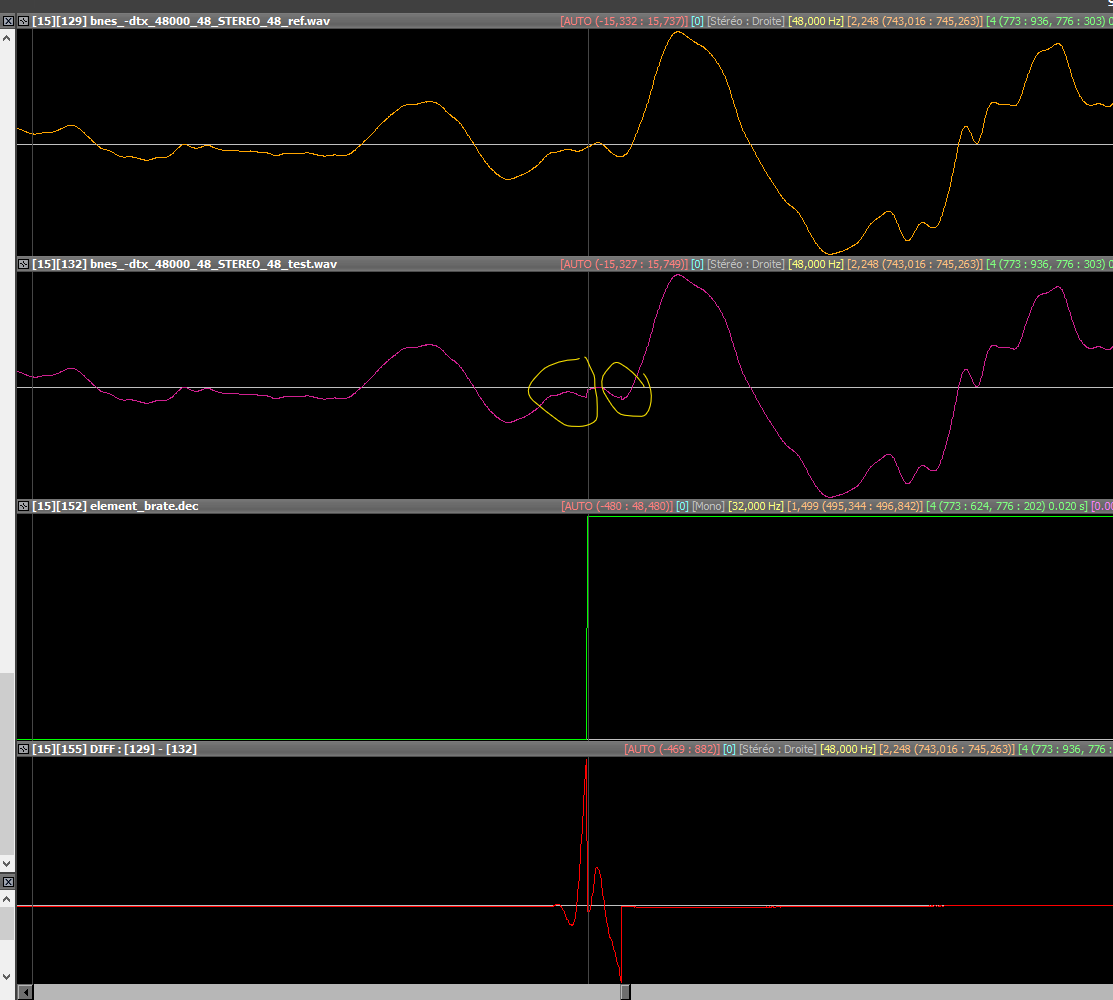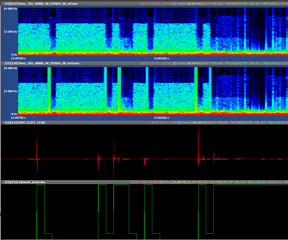 The problem happens both from CNG or DTX to active content as shown in the next figure. In the figure, the first spectrogram is the float synthesis, the second spectrogram is the fixed point synthesis the 3rd curve is the temporal difference between the 2 synthesis and the last one represent the bitrate (between 0 and 48 kbps) (BTW the spectrograms and the time domain signal are not aligned)