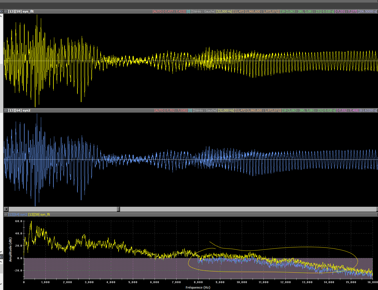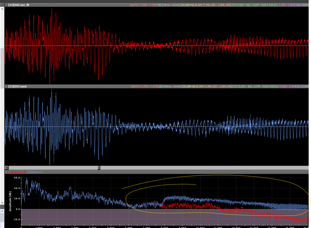 But the synthesis at that place fits on 12 bits and the high frequency content has nothing particular. So I don't believe a saturation should occurs there at this point in time. When looking at the previous frames, the level of the BWE of the left channel is below the floating point level but about 3dB (Yellow = Float; Blue=Fix-point)