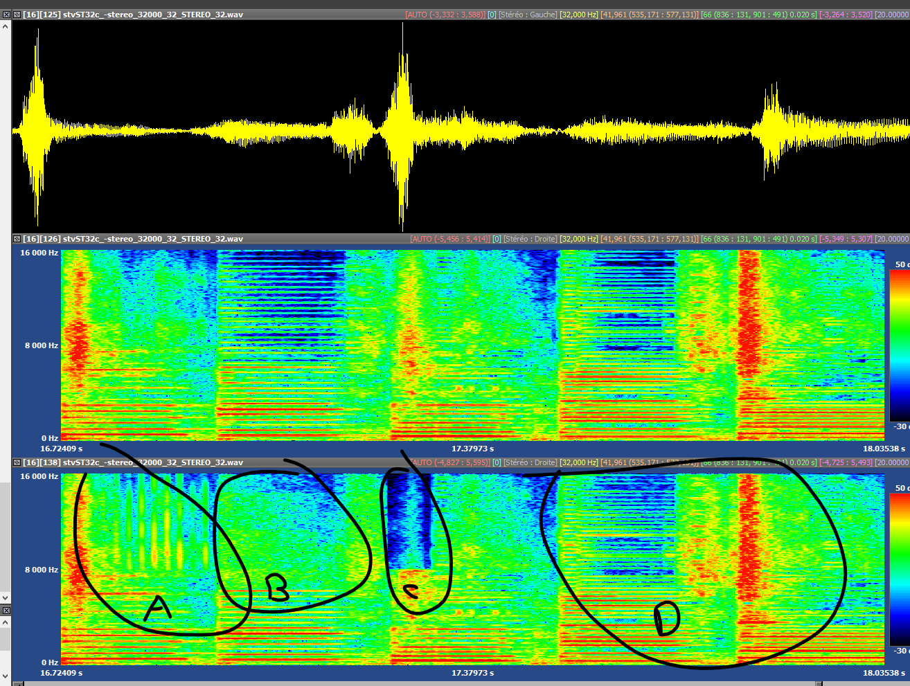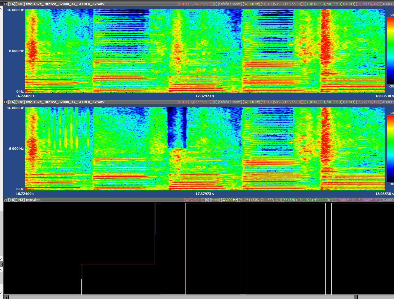 In the image below, it's the same synthesis with the core associated to it (top float, middle fix, bottom core). It seems the BWE has more issues when the core is ACELP (core==0) and TCX20 (core==1)