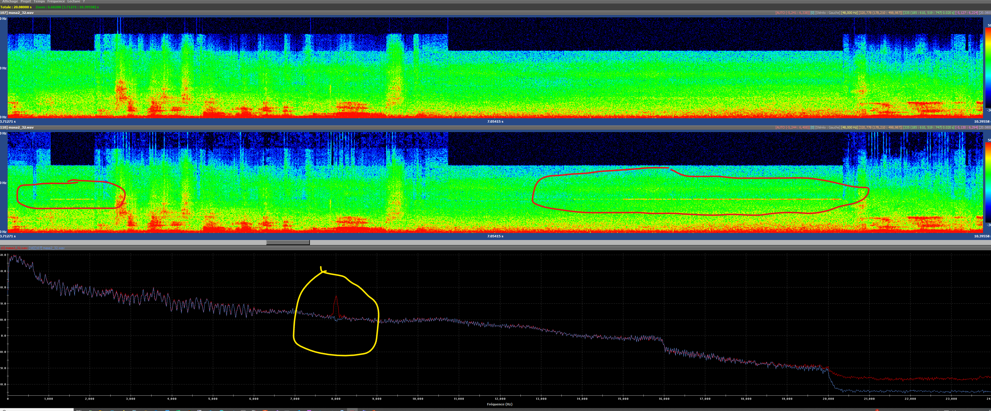 for 23094e13, we can see a frequency resonance at 8kHz during noisy segment. Figure below show the spectrograms of the left channel of the float and fixed point