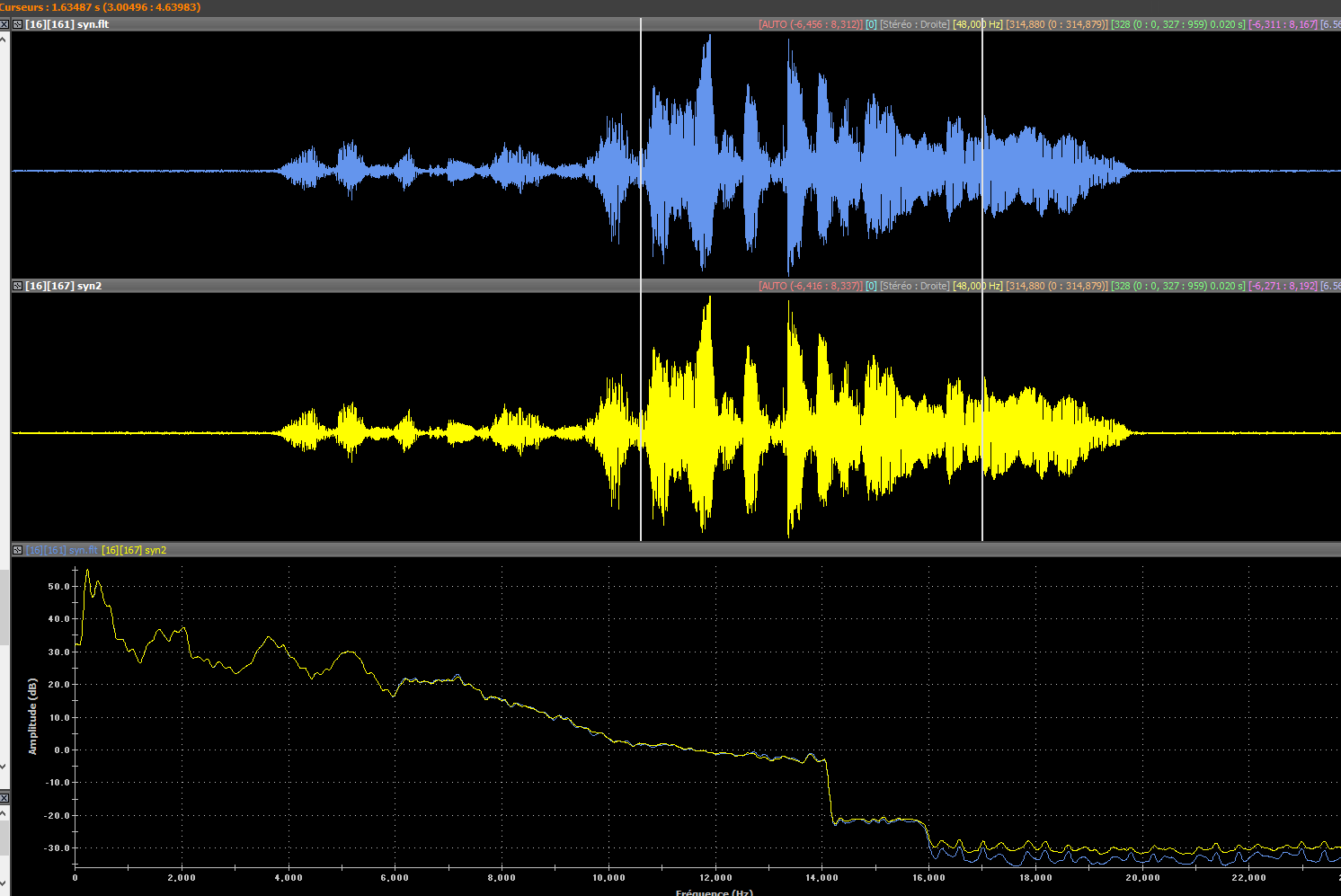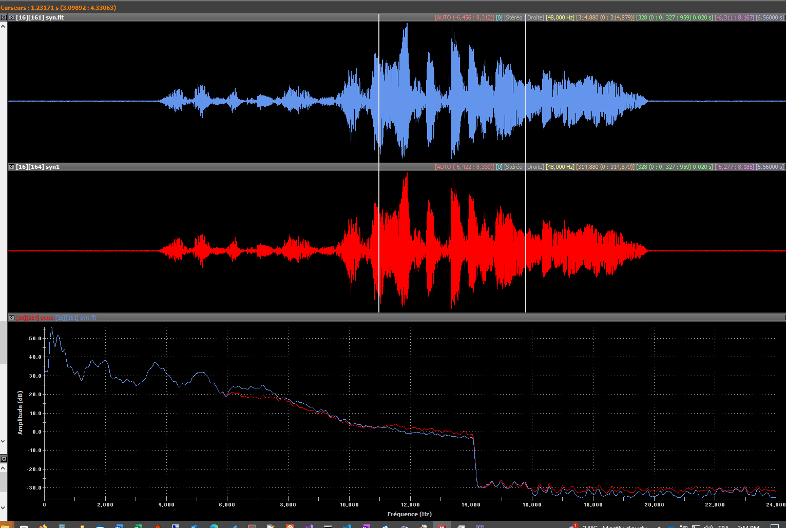 We can observe TD-BWE wrong shape in case of TD stereo. In the first figure, we can see the right channel of the floating point synthesis followed by right channel of the fixed point synthesis (same problem can be observed on the left channel) and the frequency representation of both signals.