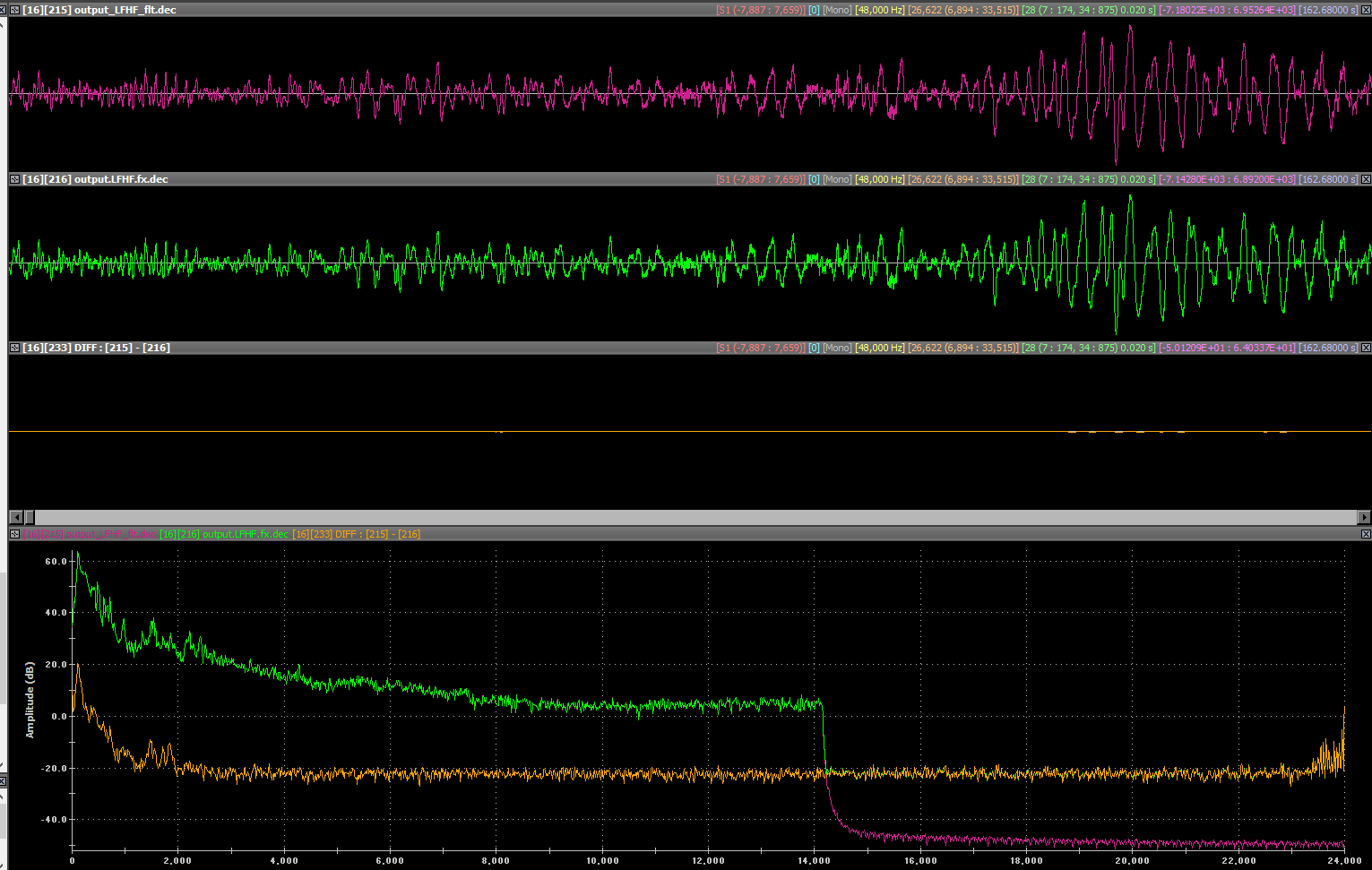 As you can see, the difference includes a lot of "spikes" which probably correspond to the "framing like" artifact heard. Also the spectrum is showing the different tilt. The fixed point LF being systematically too high while HF being systematically too low