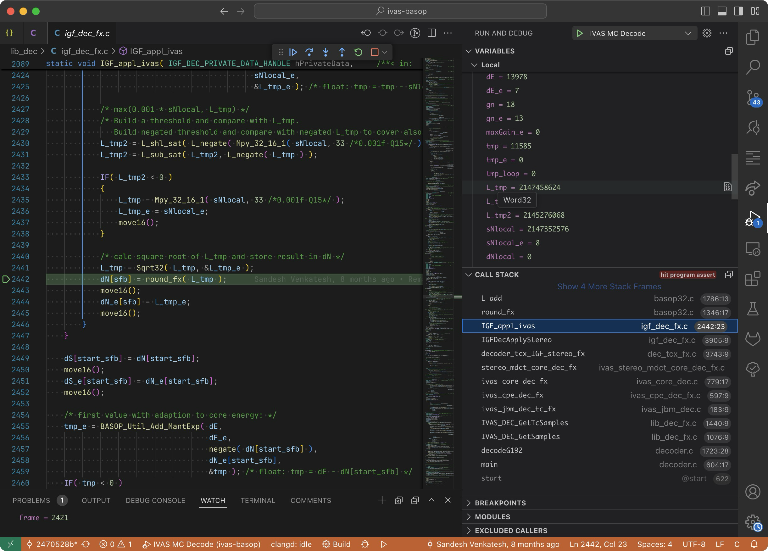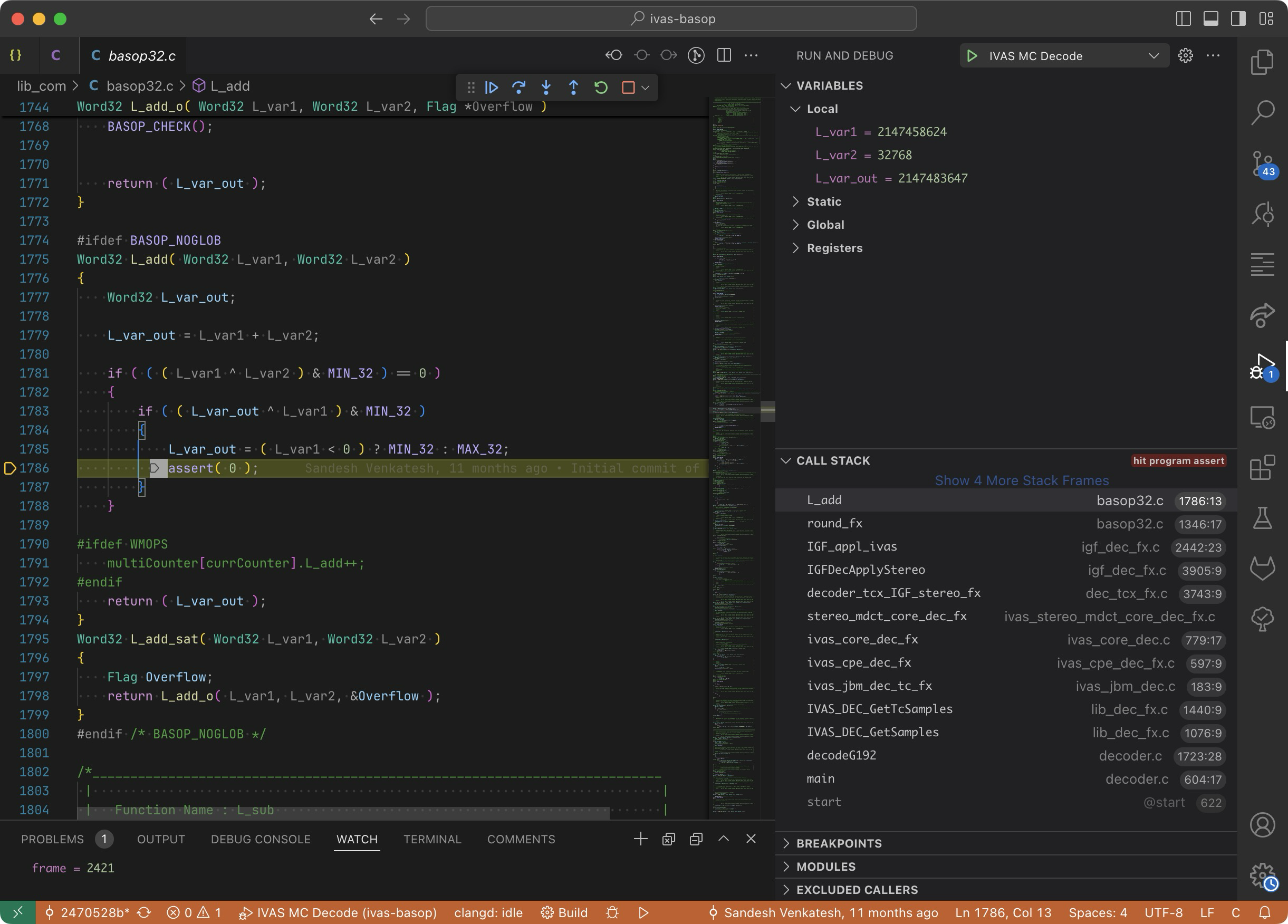 Frames processed: 2303 Assertion failed: (0), function L_add, file basop32.c, line 1786.