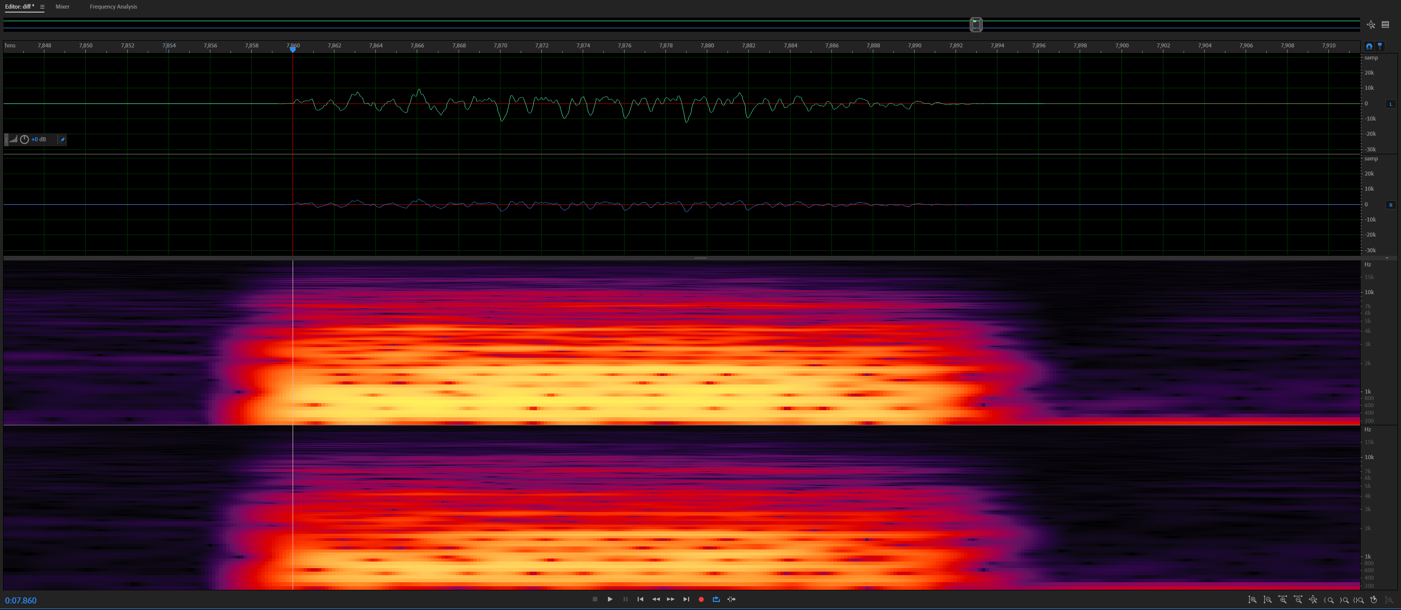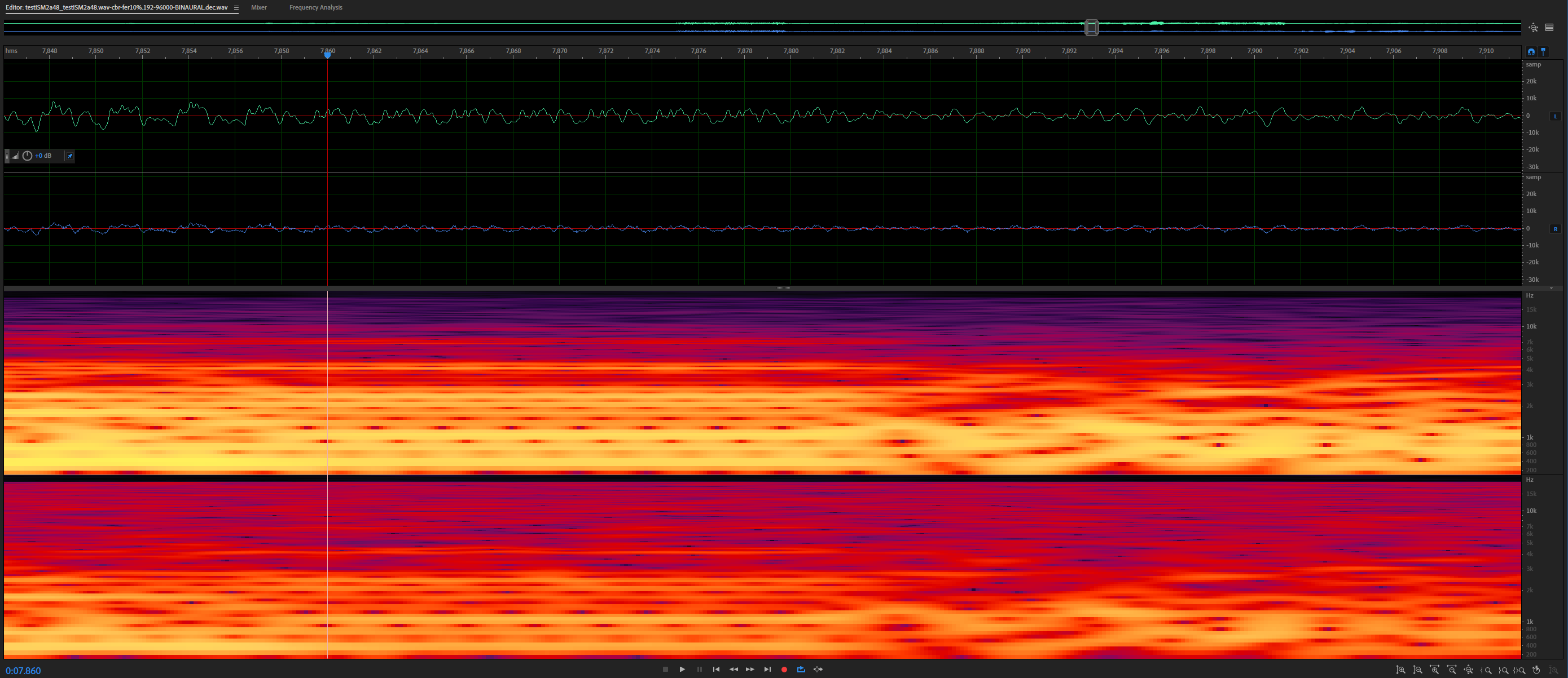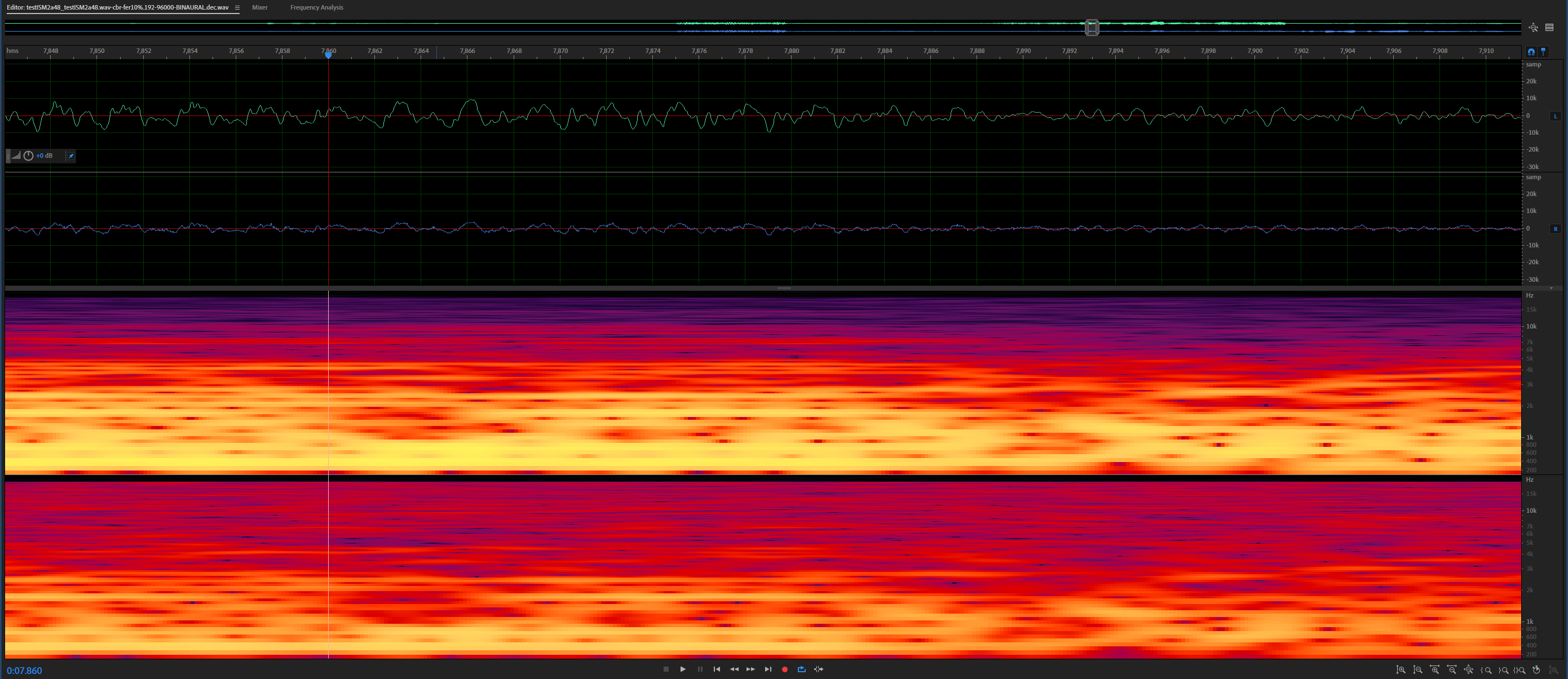 A distortion occurs between 7.86 seconds and 7.894 seconds in the test ISM file with 10% FER. The distortion is audible and present for both non-dtx and dtx cases at this specific bitrate, 96000.
