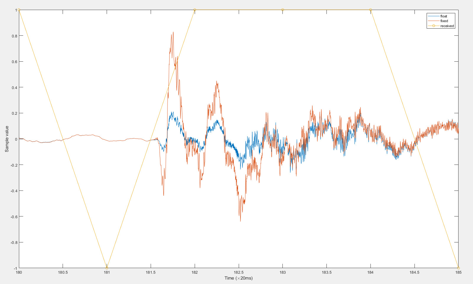 In transitioning from concealing a lost frame to decoding the first few received ones after the loss, a large deviation of the fixed-point output from the floating point one is observed. The two waveform converged after a few frames. I suspect there is some xfade going wrong in there.